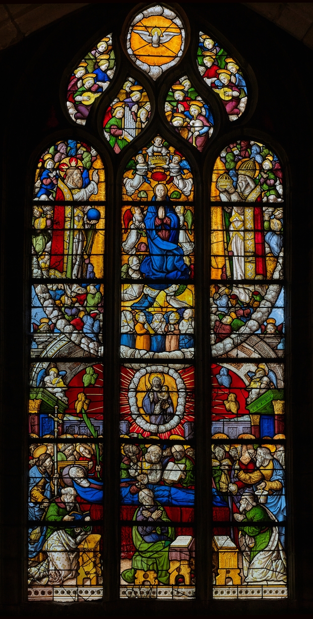 Verrière : Dormition et couronnement de la Vierge, chapelle du Notre-Dame-du-Crann (Spézet),