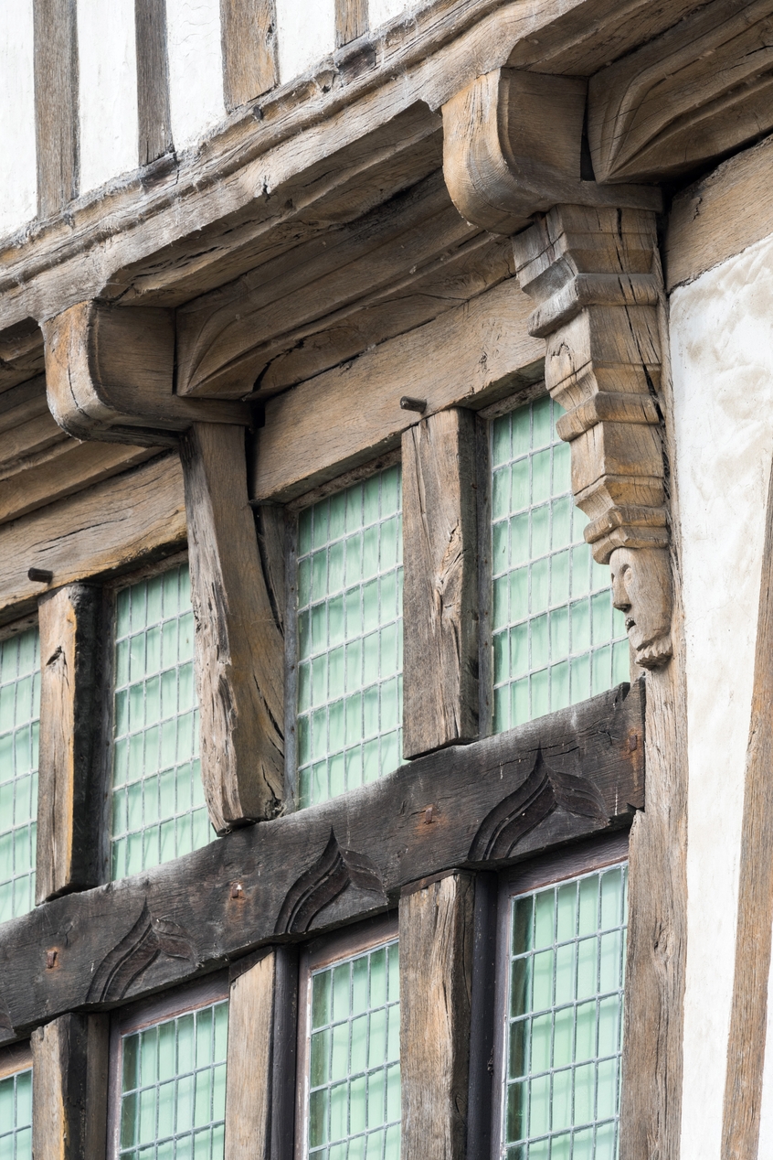 Détail des moulures sur une partie remaniée de la façade en pan de bois.Immatriculation