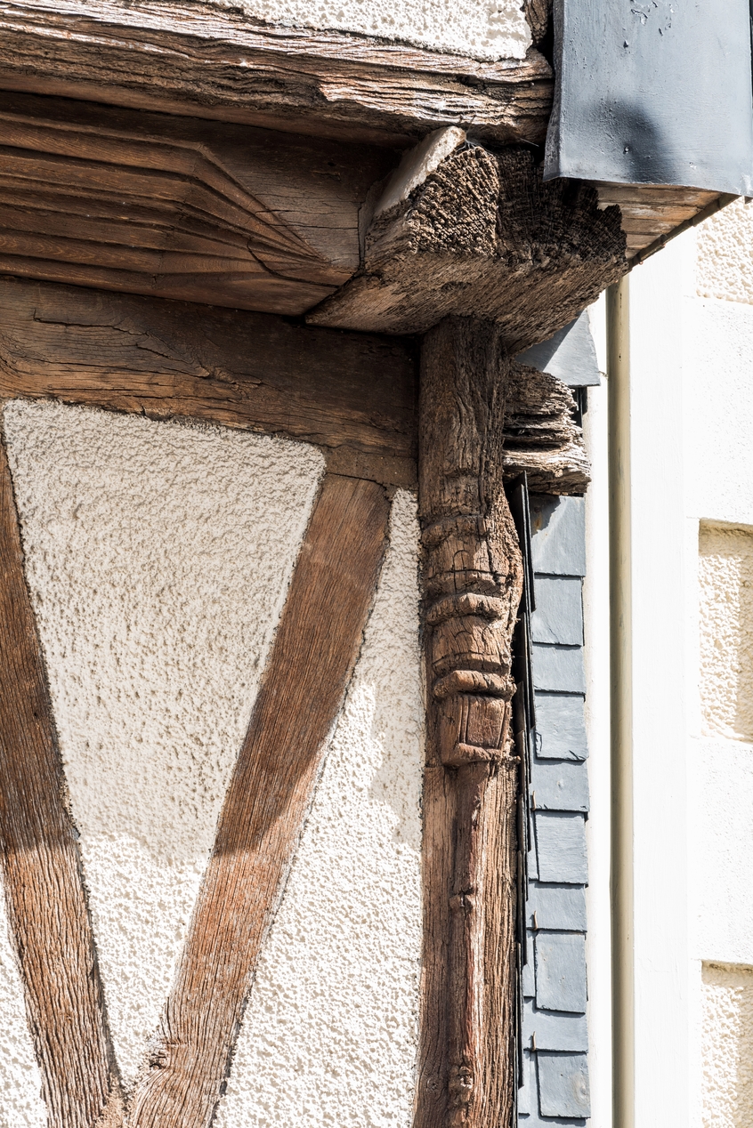 Détail du pigeâtre sculpté qui renforce l'assemblage entre la tête de solive et le poteau.