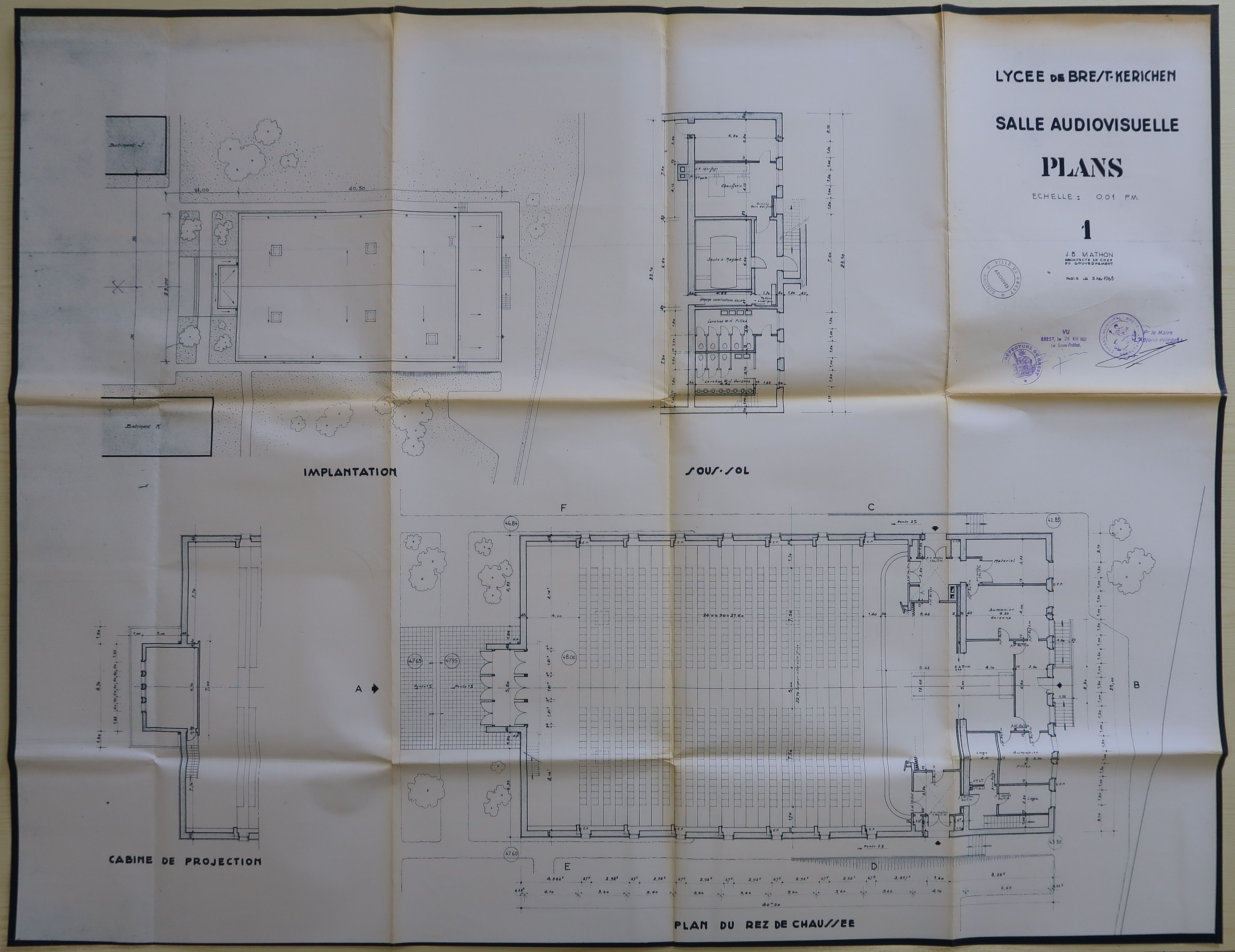 Salle audiovisuelle. Plans. Jean-Baptiste Mathon, architecte, 5 février 1963. Noter la présence d'une cabine de projection et le positionnement au sous-sol des lavabos et toilettes.Immatriculation