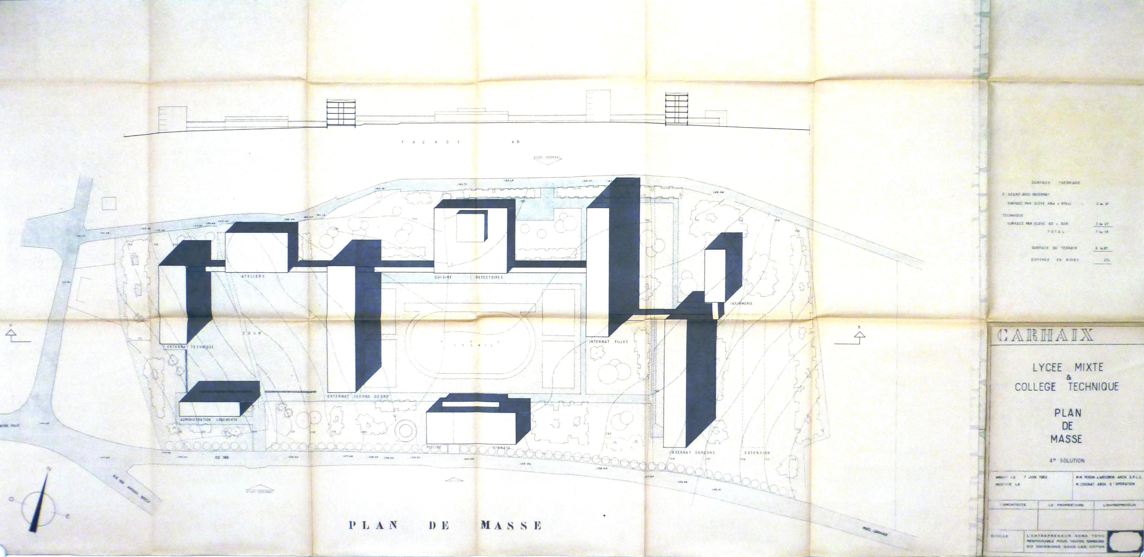Projet "4e solution" de plan de masse pour le "Lycée mixte et collège technique" de Carhaix. 7 juin 1962. Péron et Weisbein, architectes. Projet qui privilégiait une orientation nord-sud pour les internats et externats. Non retenu par le CGBF.Immatriculation