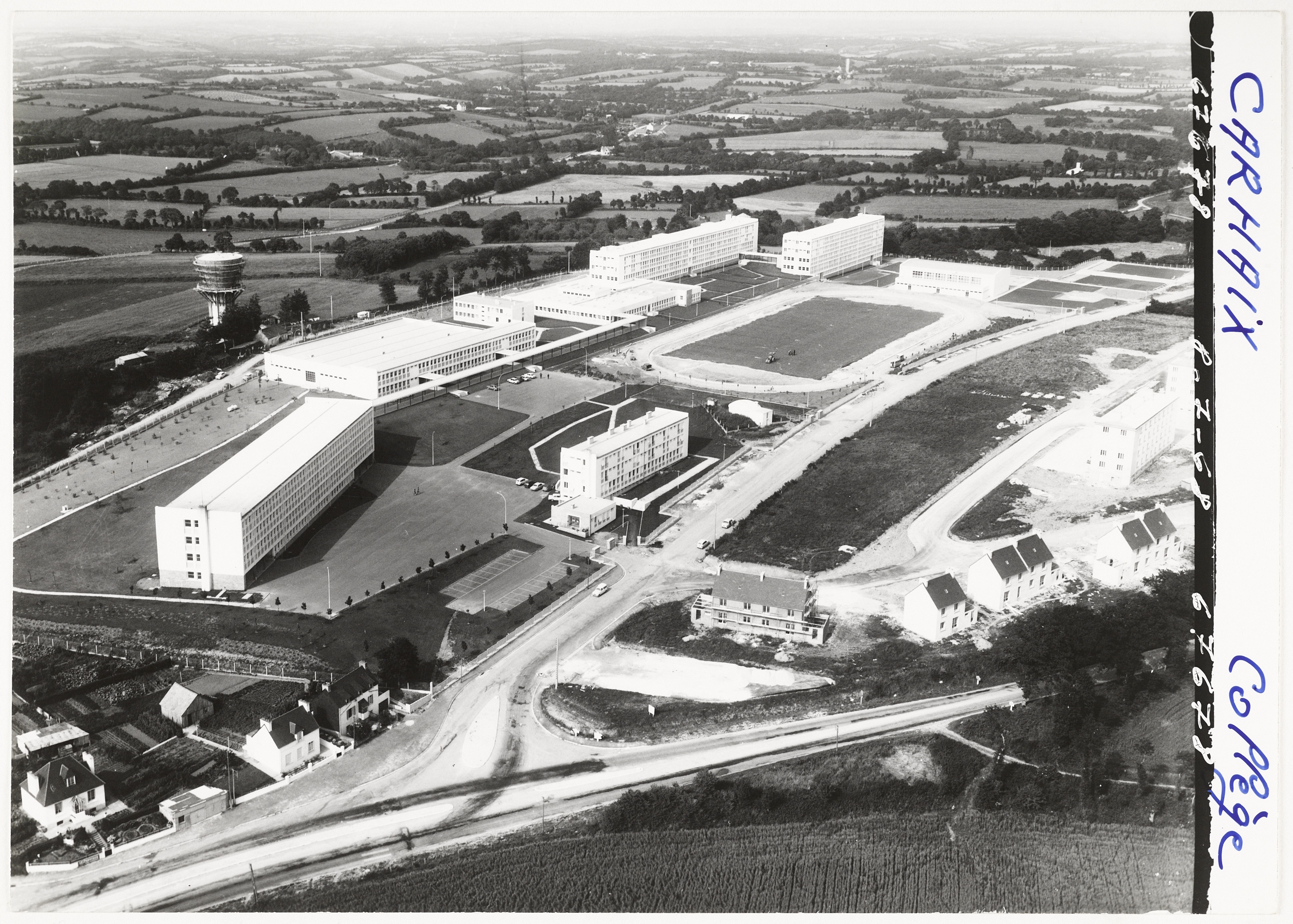 Vue aérienne (Heurtier, photographe), prise du sud-ouest, le 2 juillet 1968. Les bâtiments sont tous construits, le terrain de sport en cours d'achèvement. Péron et Weisbein, architectes, 1967-1968.Immatriculation