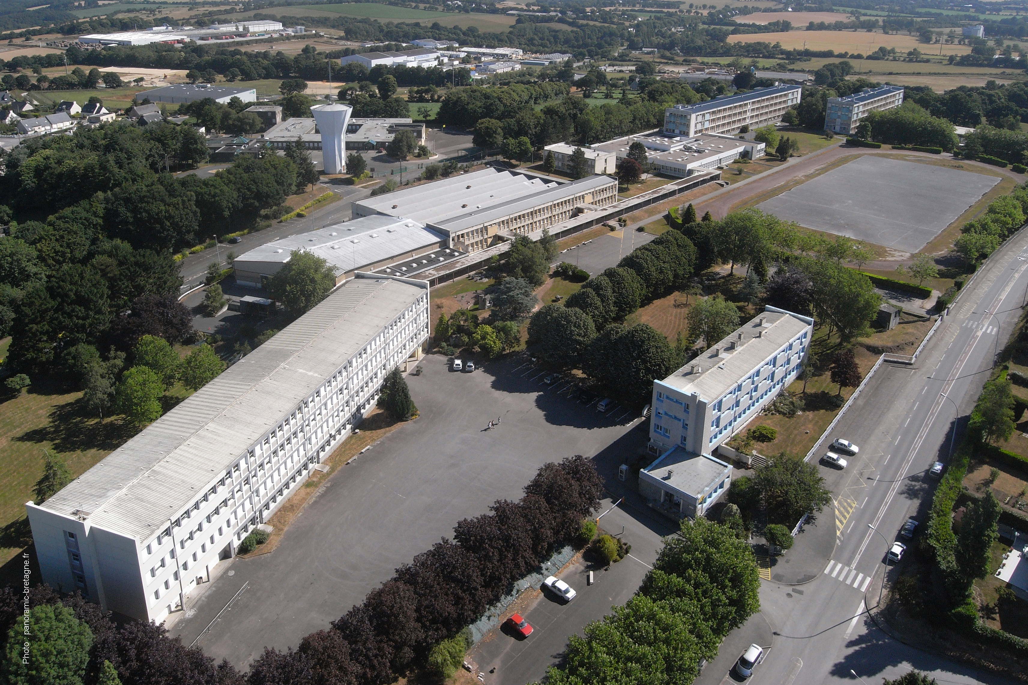 Vue aérienne prise de l'ouest-sud-ouest. Les haies bocagères sont encore présentes, au nord, mais la zone d'activité donne un caractère périurbain au paysage environnant.Immatriculation