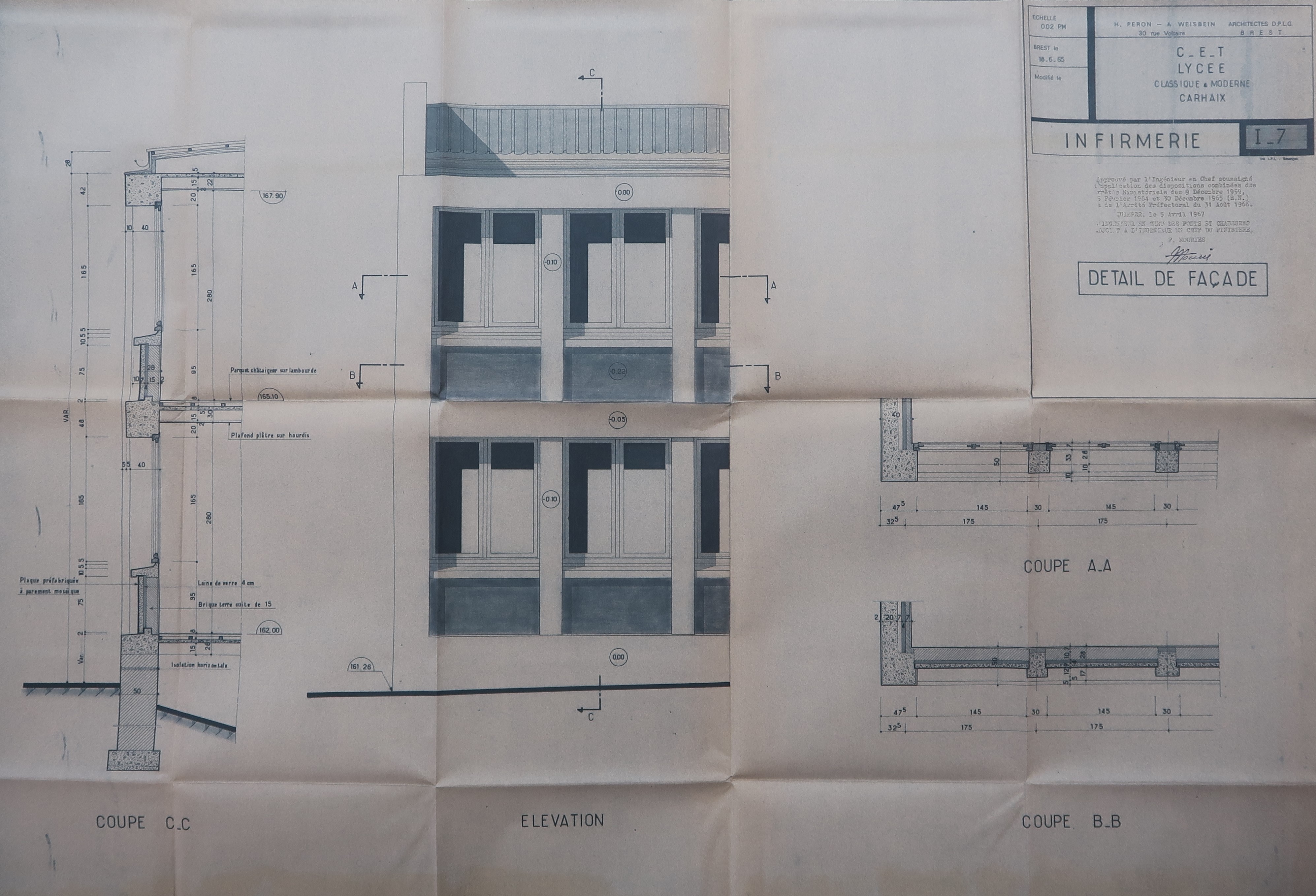 Archives départementales du Finistère : 107W39. Péron [H.] et Weisbein [A.], Ensemble de plans et élévations du CET et lycée classique et moderne de Carhaix, 1965 - 1966