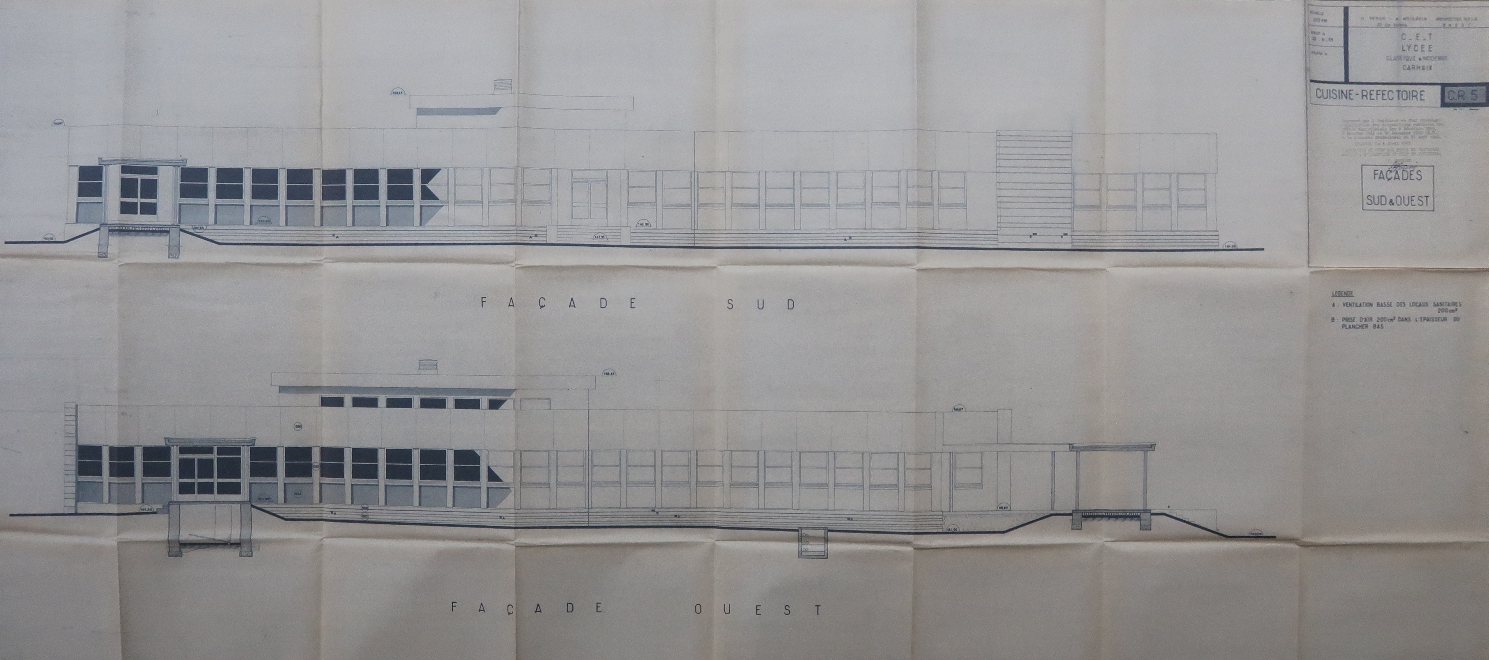 Elévations des façades sud et ouest du bâtiment "cuisine - réfectoire". Hervé Péron et Alexandre Weisbein, architecte, 1965.Immatriculation