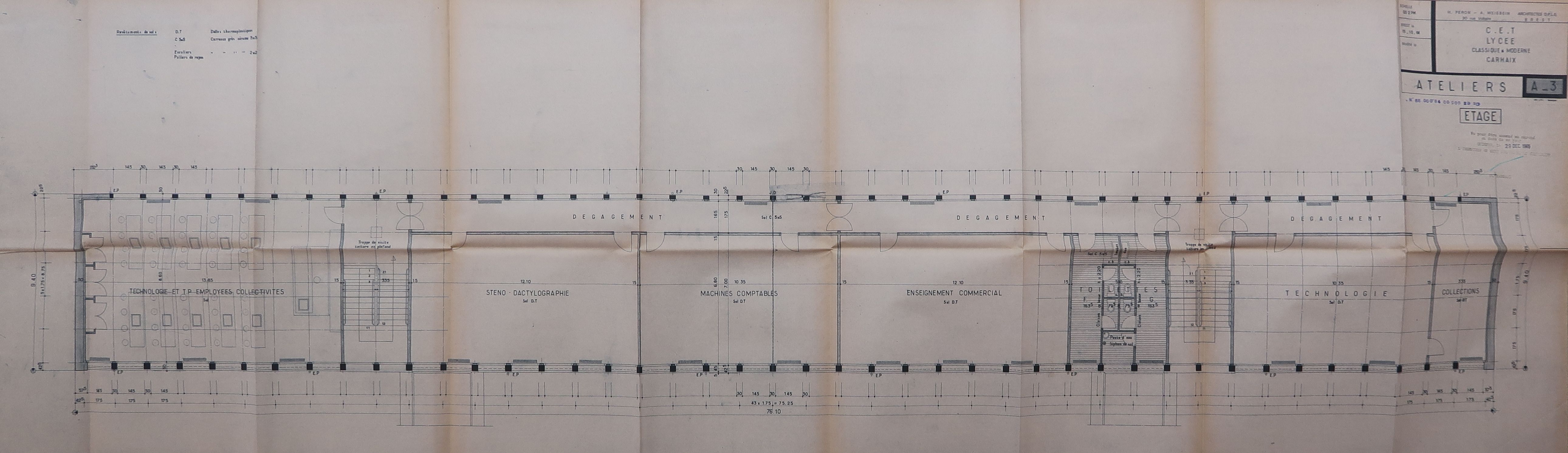 Archives départementales du Finistère : 107W51. Péron [h.] et Weisbein [A.], CET-Lycée classique et moderne-Carhaix. Plans du gymnase, de l'externat et des ateliers, 1964.