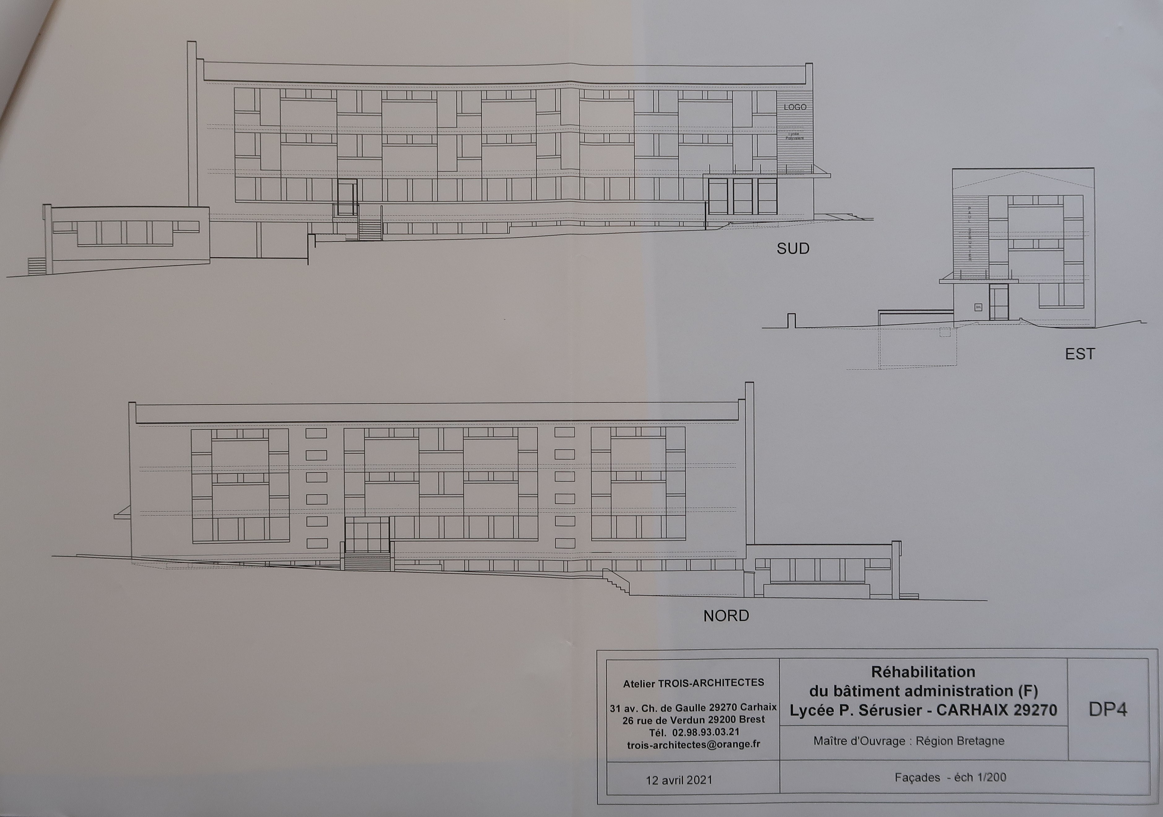 Elévations des façades nord, sud et est lors de la restructuration du bâtiment d'accueil, administration et logements. A3A architectes, 2021. Noter la création d'un auvent et le bardage bois au-dessus du nouveau hall d'accueil.Immatriculation