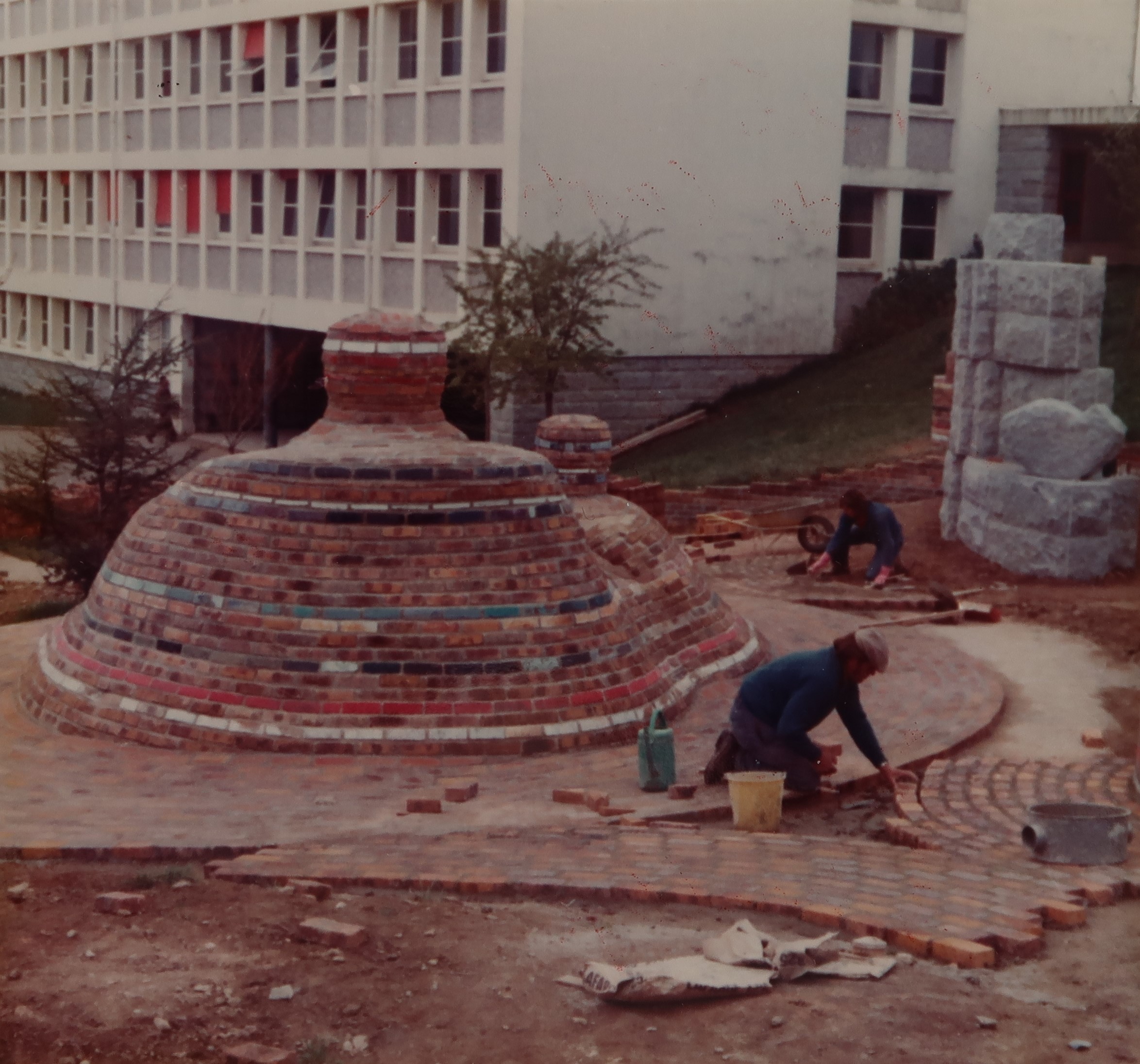 Sculptures de Klaus Schultze et Robert Fachard (à droite). Le premier, et son "aide", sont en train d'achever la pose des briques sur le cheminement autour de l'ensemble des sculptures.Immatriculation
