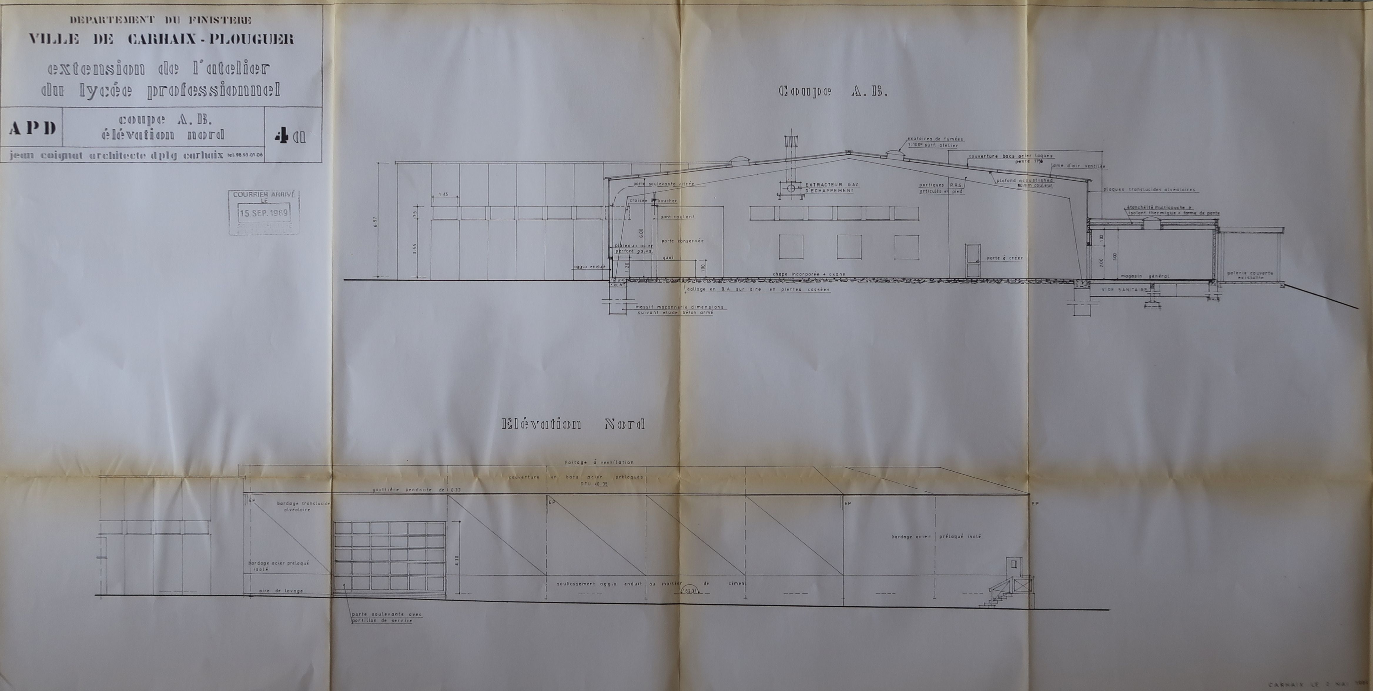 Extension des ateliers du lycée professionnel, coupe et élévation nord (Jean Coignat, architecte, 1989).Immatriculation