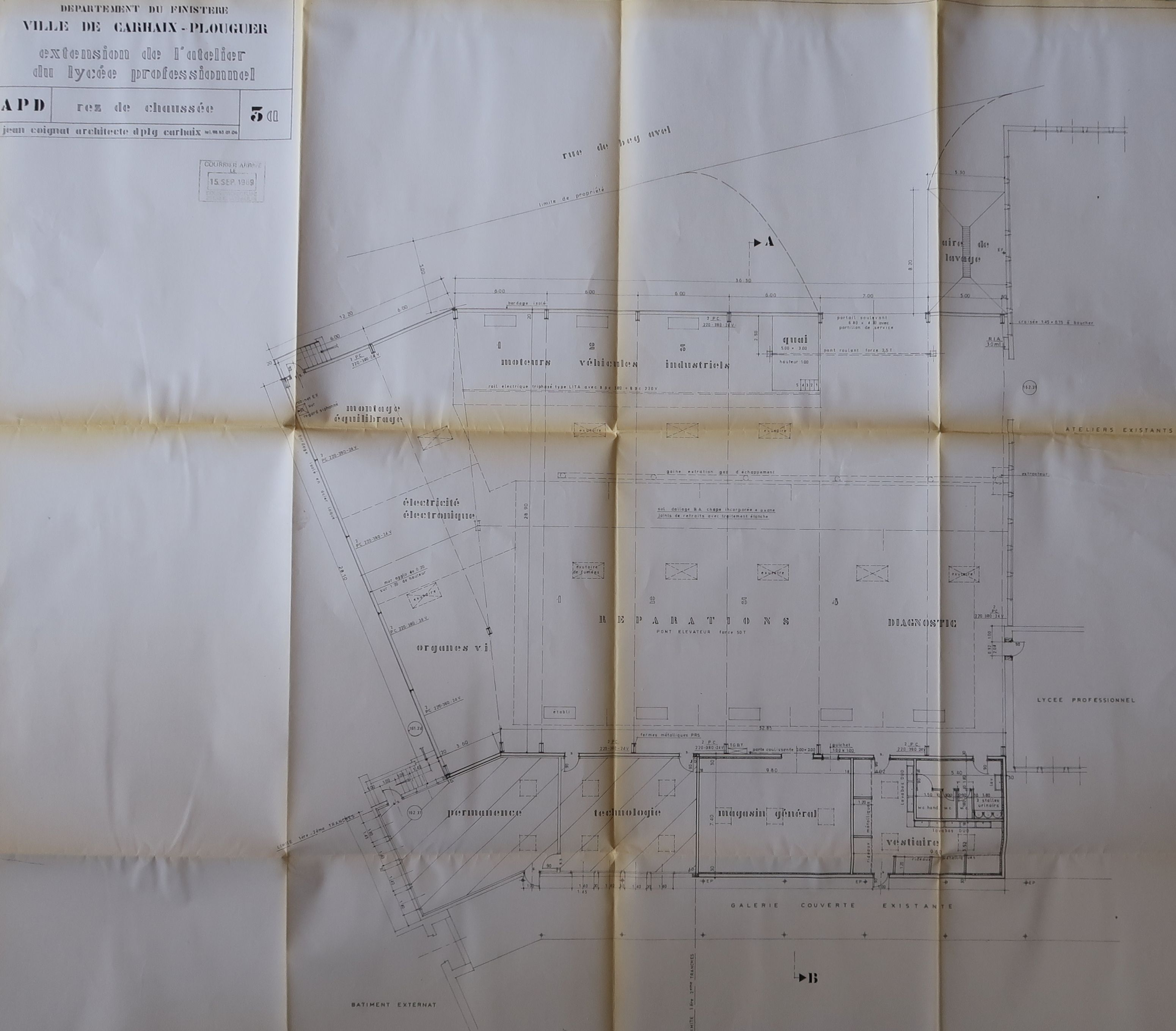 Extension des ateliers du lycée professionnel, plan du rez-de-chaussée (Jean Coignat, architecte, 1989).Immatriculation