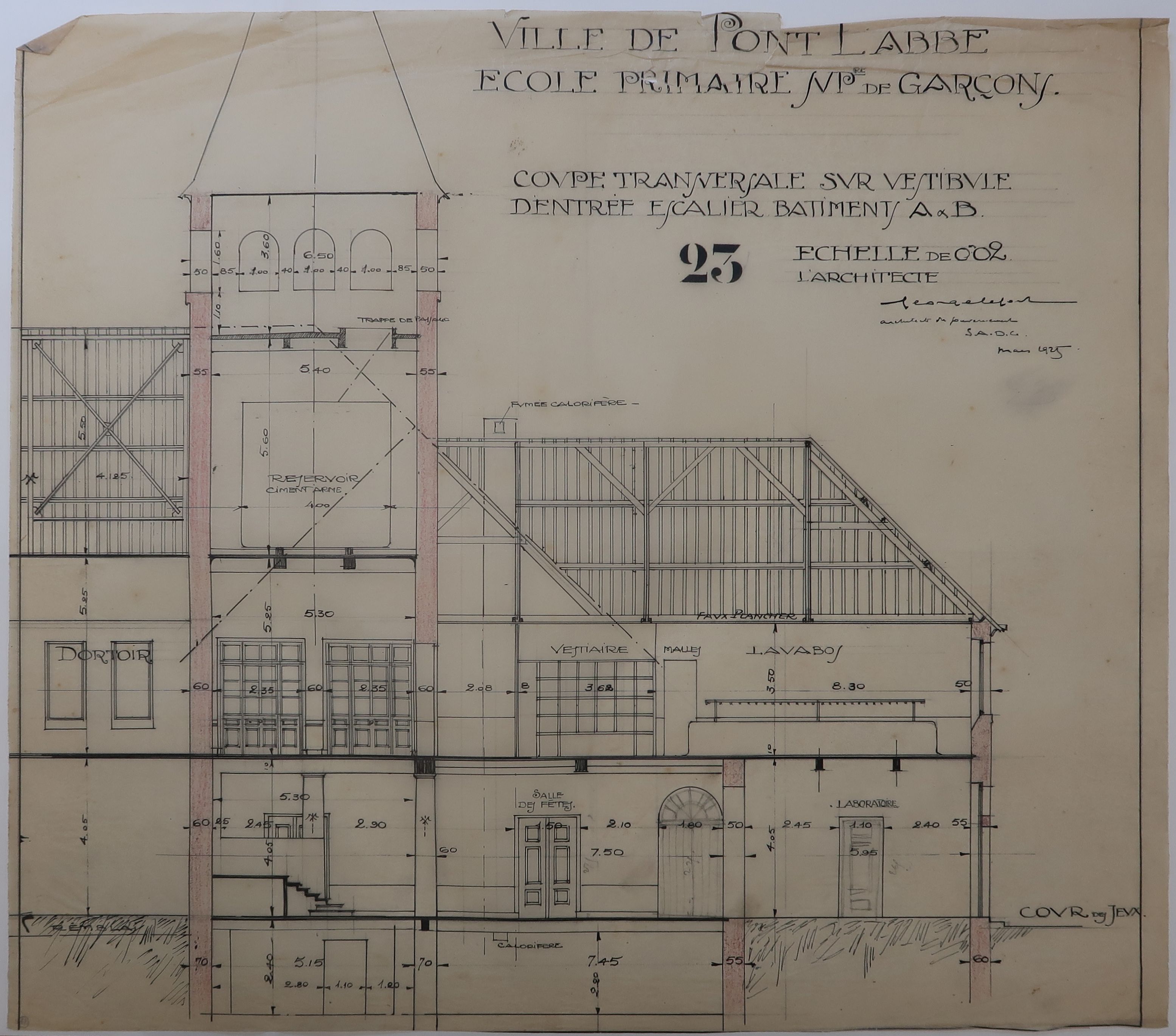 Archives départementales des Côtes-d'Armor : 124J186. Lefort [G-R.], Jeu de plans et dessins de l'école primaire supérieure de Pont-l'Abbé, 1925-1928.