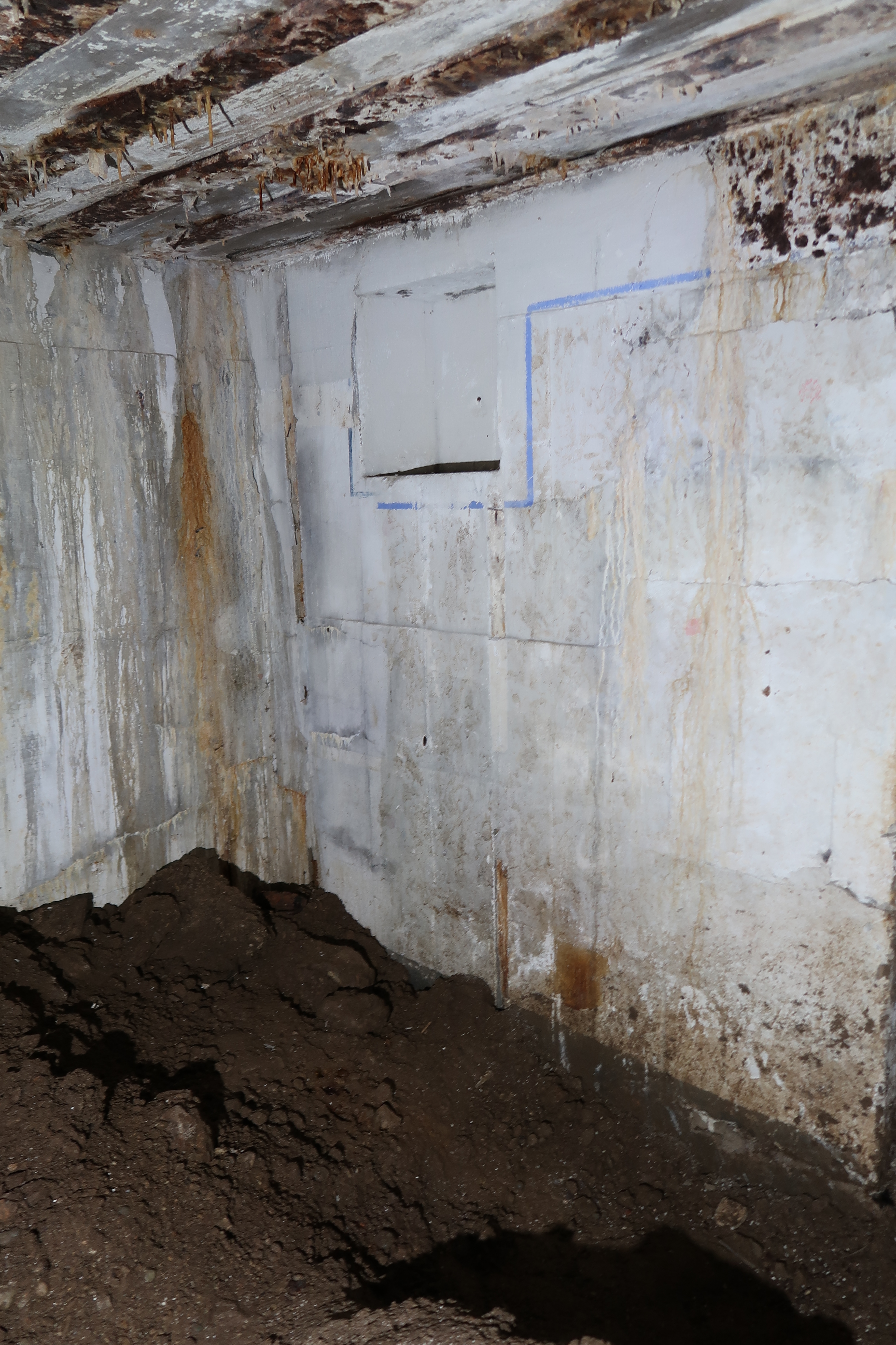 Vue de la pièce de vue - chambre de troupe (état en 2021). Sur le mur doté d'une niche, liseré de couleur bleue faisant friseImmatriculation