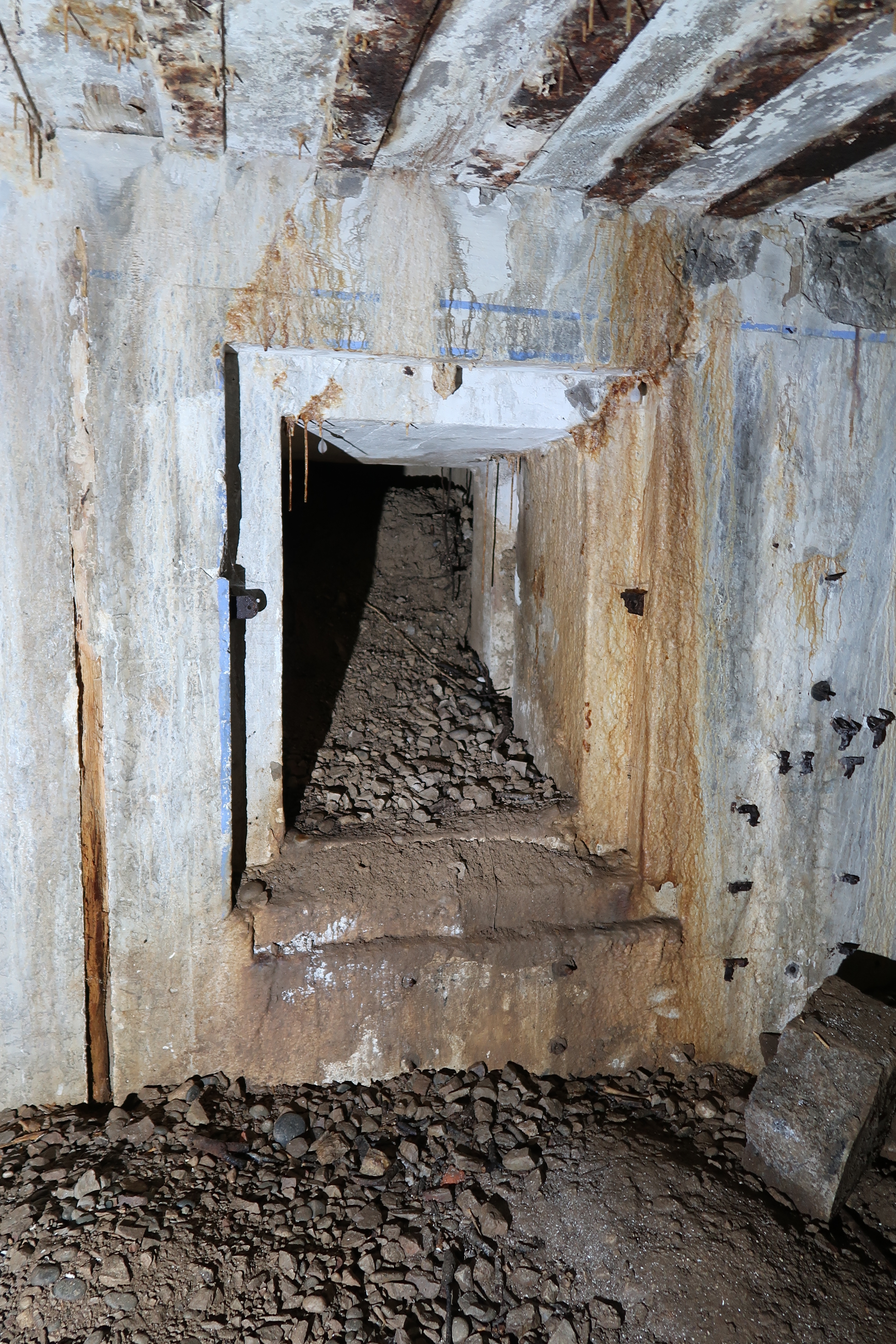 Vue de la sortie de secours de la pièce de vue - chambre de troupe (état en 2021). Sur le mur, liseré de couleur bleue faisant friseImmatriculation