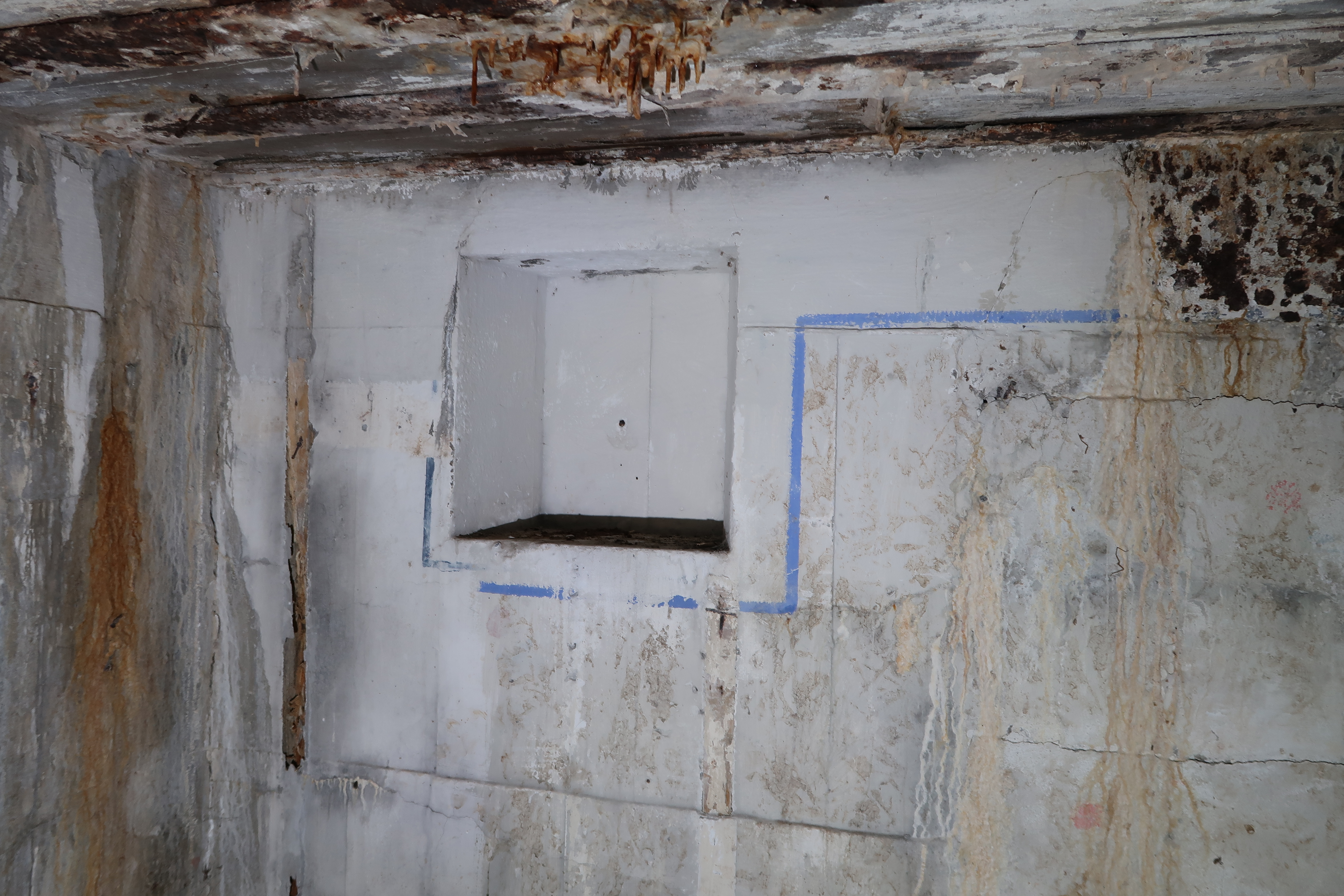 Vue de la pièce de vue - chambre de troupe (état en 2021). Sur le mur doté d'une niche, liseré de couleur bleue faisant frise et fleur au pétale rougeImmatriculation
