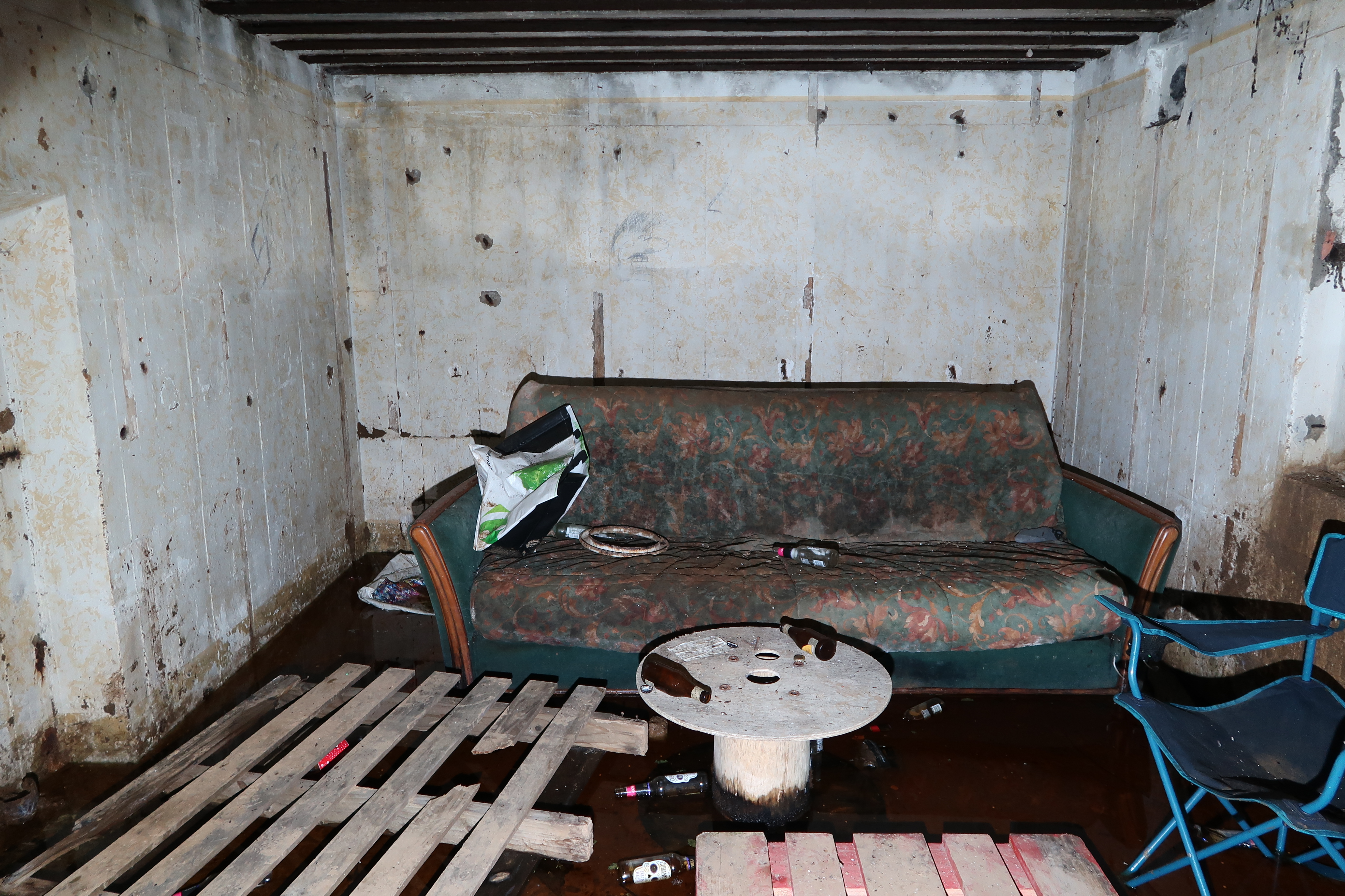 Vue générale de la pièce de vie - chambre de troupe. Cette pièce dotée de mobilier est en partie inondée (état en 2021)Immatriculation