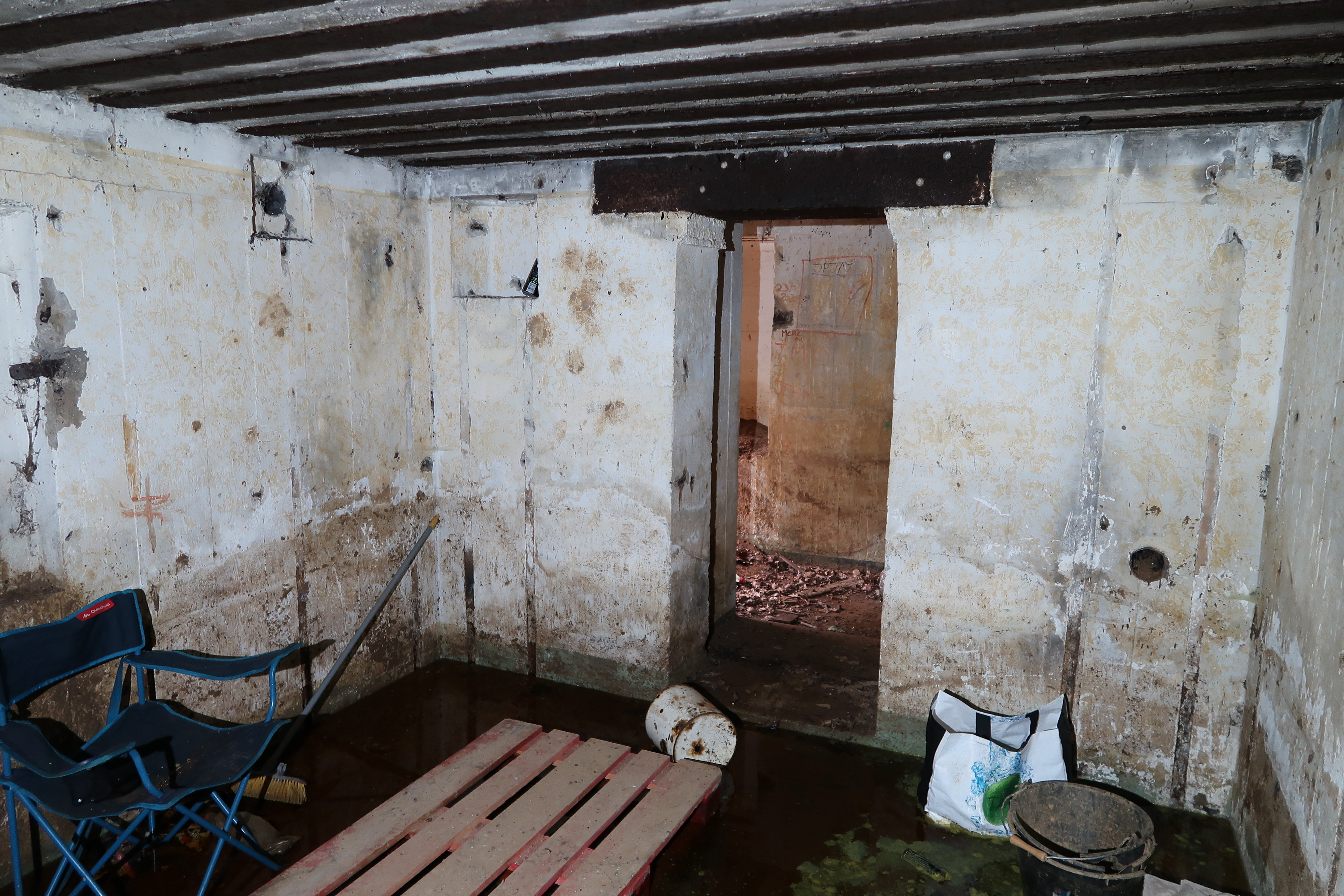 Vue générale de la pièce de vie - chambre de troupe. Cette pièce dotée de mobilier est en partie inondée (état en 2021)Immatriculation
