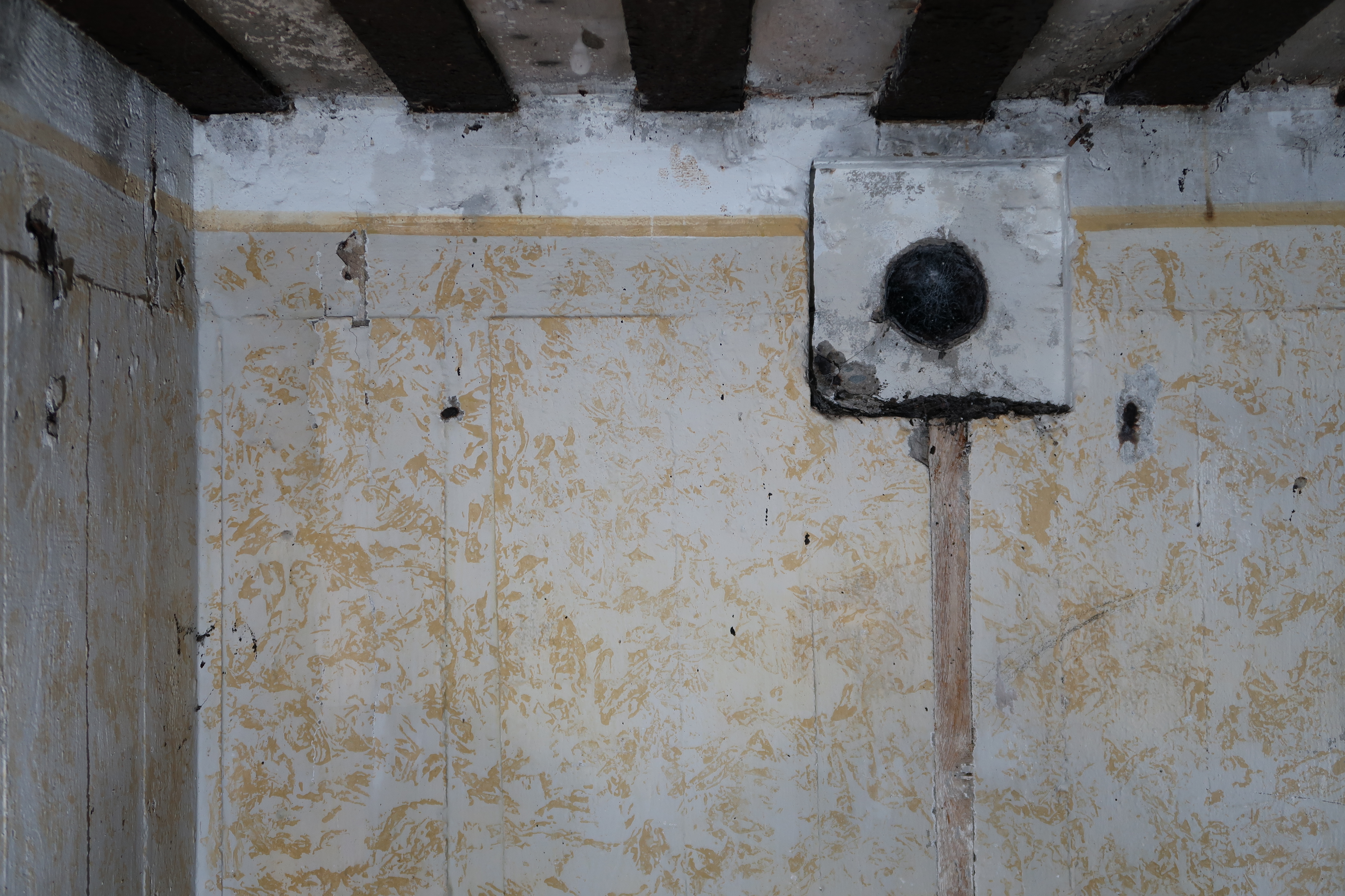 Vue de l'un des murs ayant conservé sa peinture murale tachetée ocre jaune d'origine (état en 2021)Immatriculation
