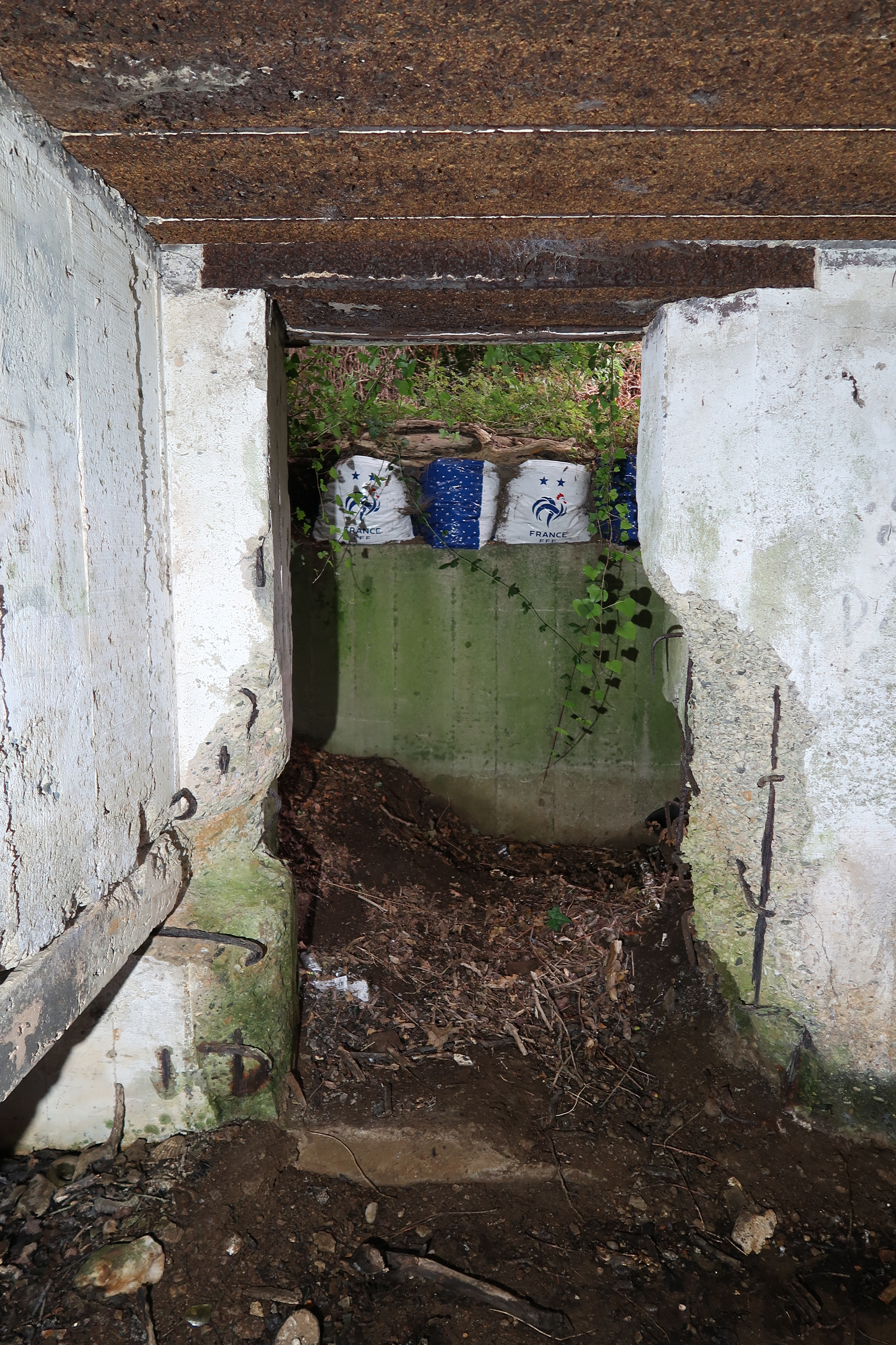 Vue de l'entrée de la chambre de tir depuis l'intérieur (état en 2021). A gauche, niche murale pour entreposer les munitionsImmatriculation
