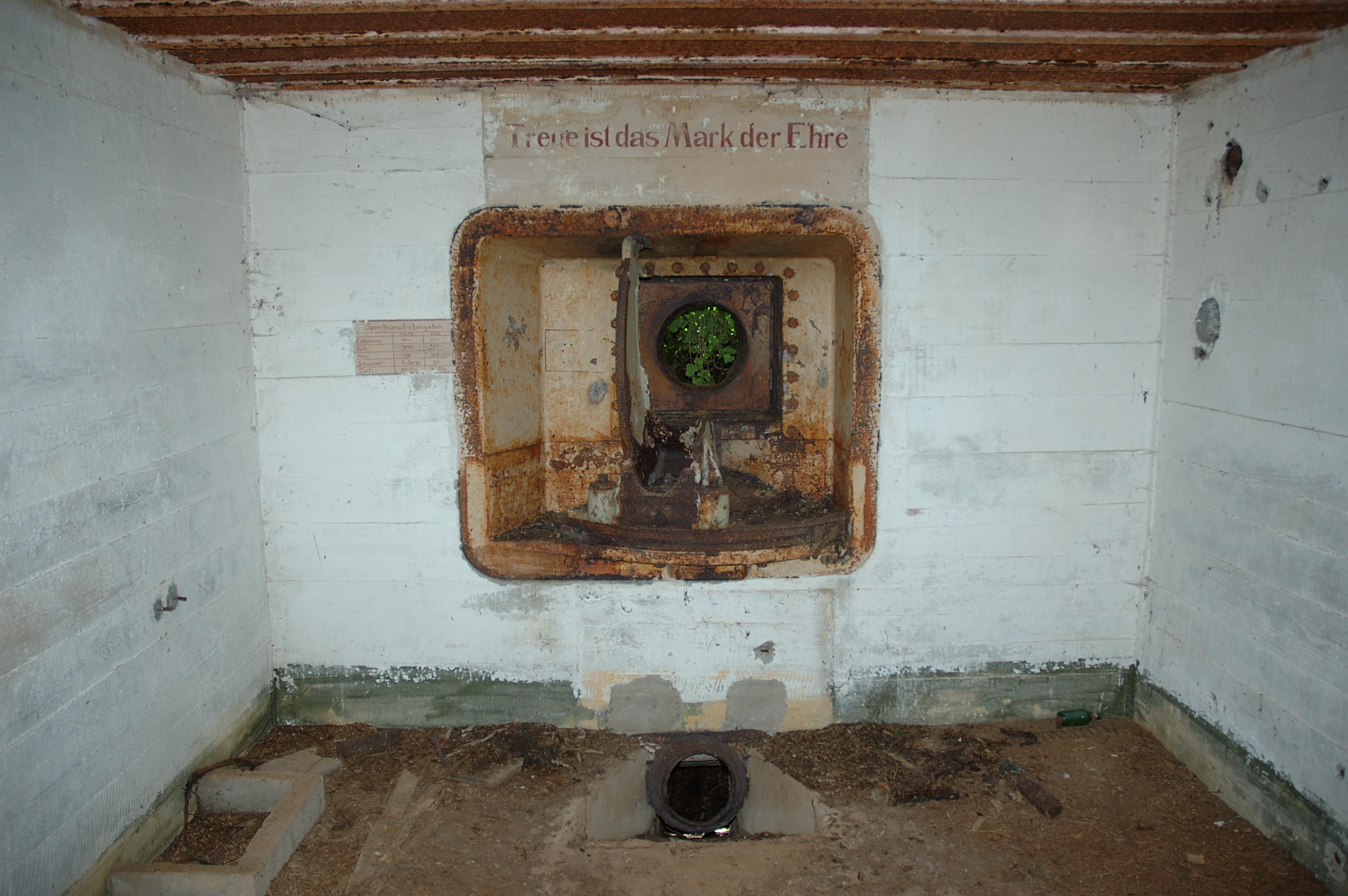 Vue de l'embrasure de la chambre de tir : peintures murales allemandes, maxime "Treue ist das Mark der Ehre" (La loyauté est la moelle de l'honneur) et instructions de tir (état en 2005). Au niveau du sol, orifice d'éjection des douillesImmatriculation