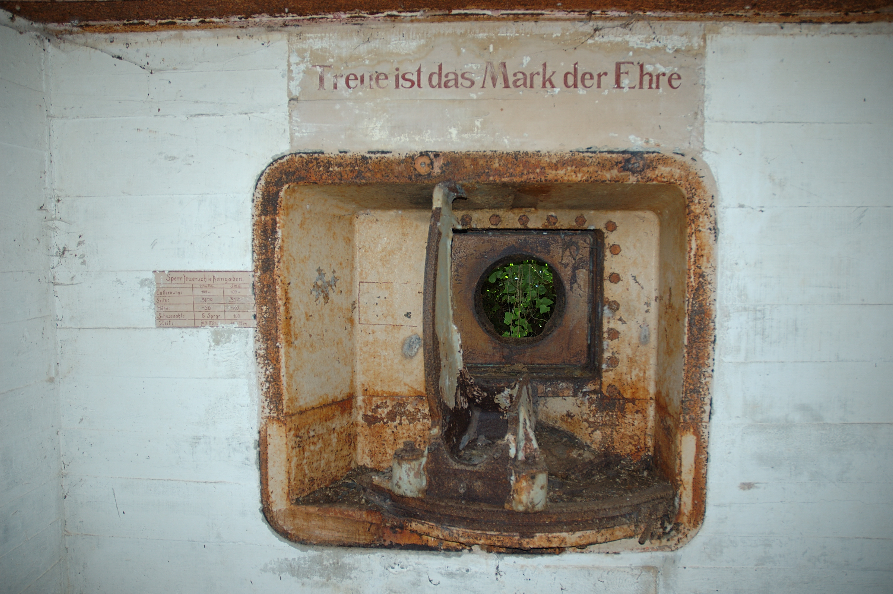 Vue de l'embrasure de la chambre de tir : peintures murales allemandes, maxime "Treue ist das Mark der Ehre" (La loyauté est la moelle de l'honneur) et instructions de tir (état en 2005)Immatriculation