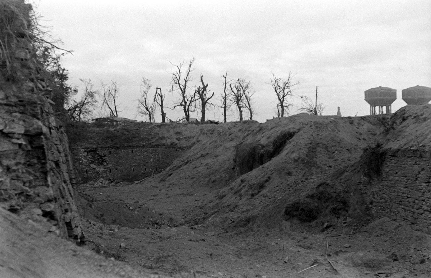Vue du Fort de Keranroux après les combats du 13 septembre 1944 : fossé sec sud (à droite, les deux châteaux d'eau de la rue de Kerourien), photographie de David E. Scherman pour Life Magazine (Google Arts et Culture)Immatriculation