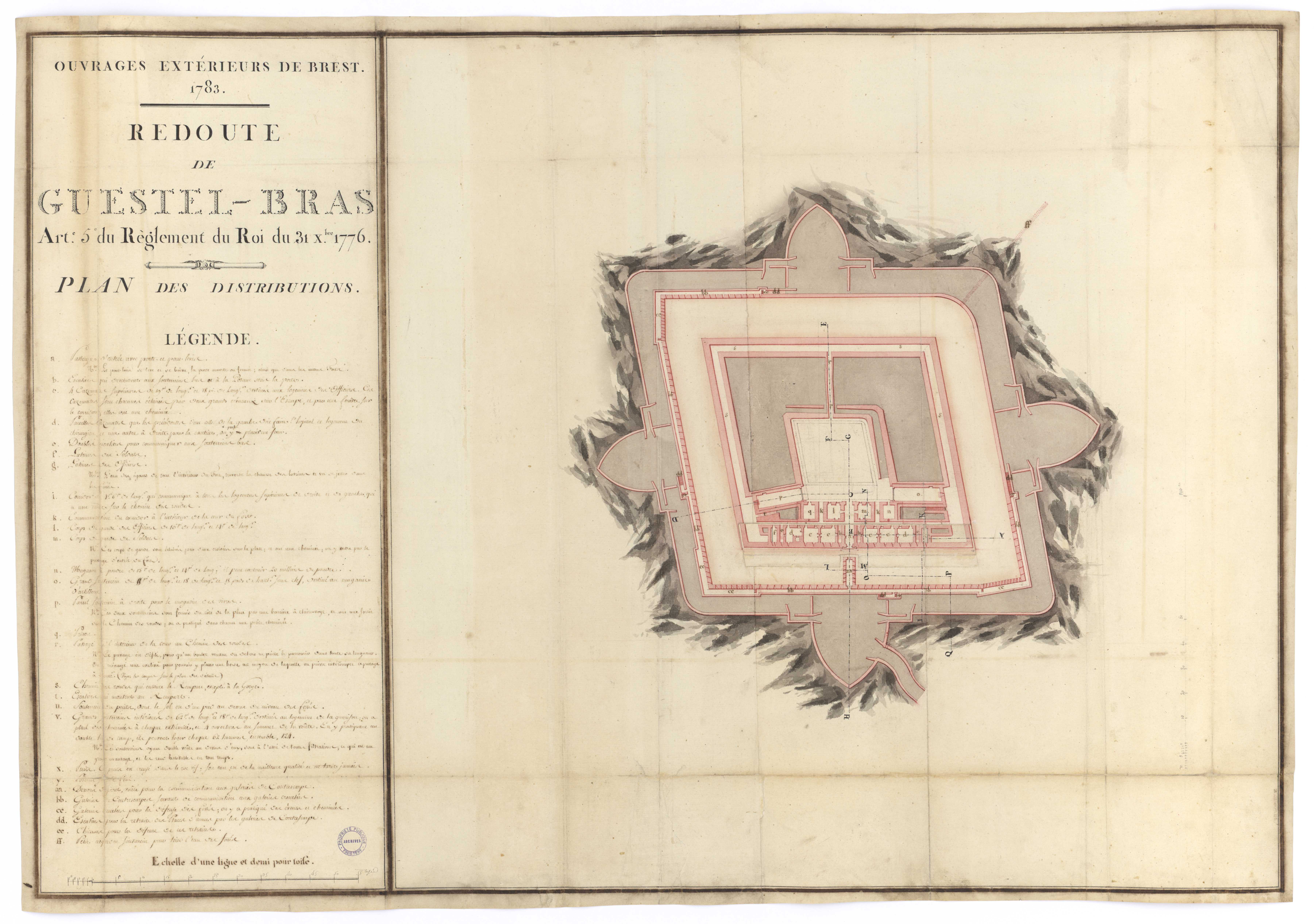 Plan de la Redoute de Guestel-Bras, "avec ses distributions", 1783 (Archives départementales du Finistère, 9Fi1)Immatriculation