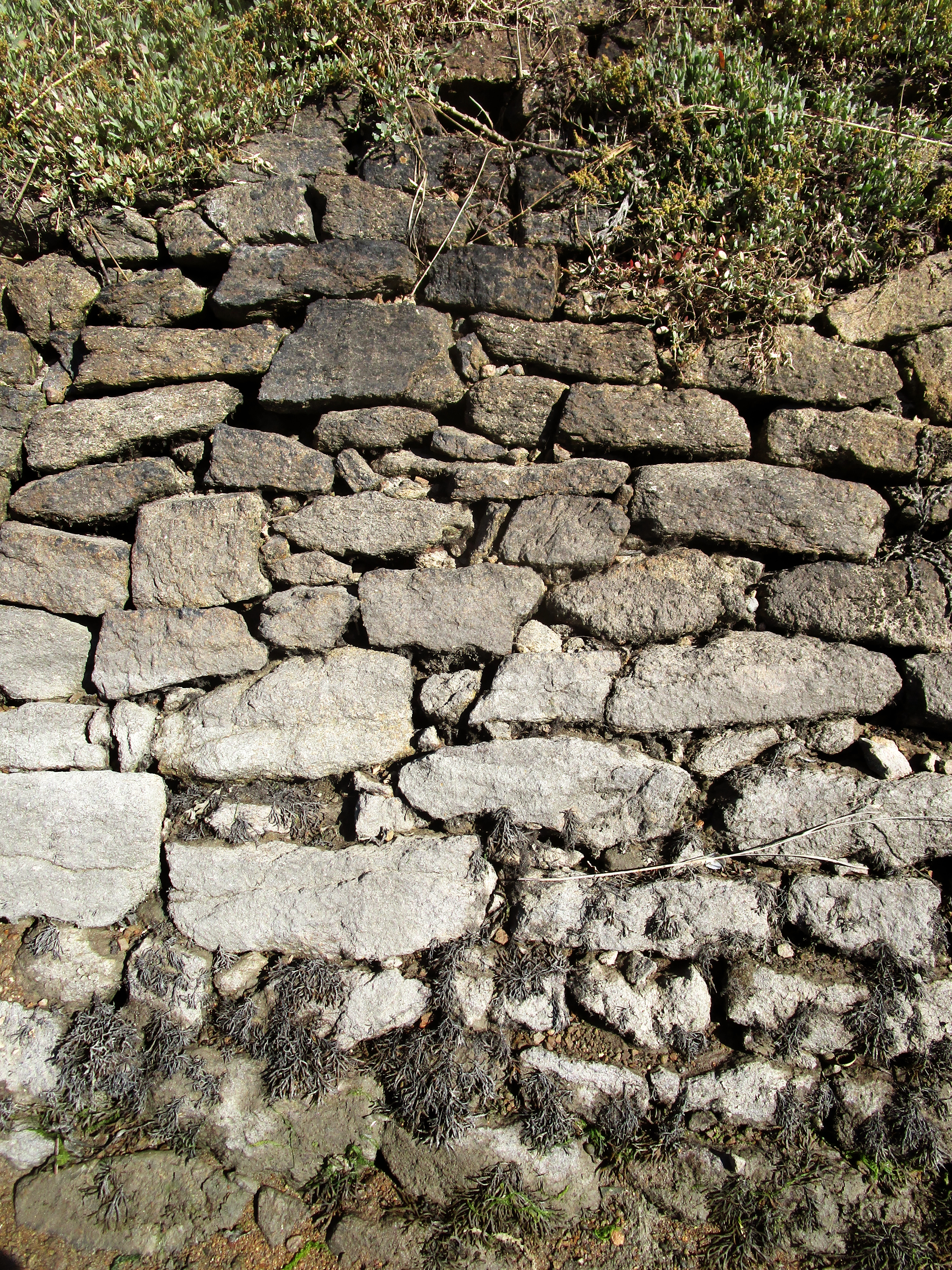 Ligne Audierne-Douarnenez entre Audierne et Pont-Croix, perré en pierres sèches le long de la berge droite du Goyen. Détail de la maçonnerie.Immatriculation