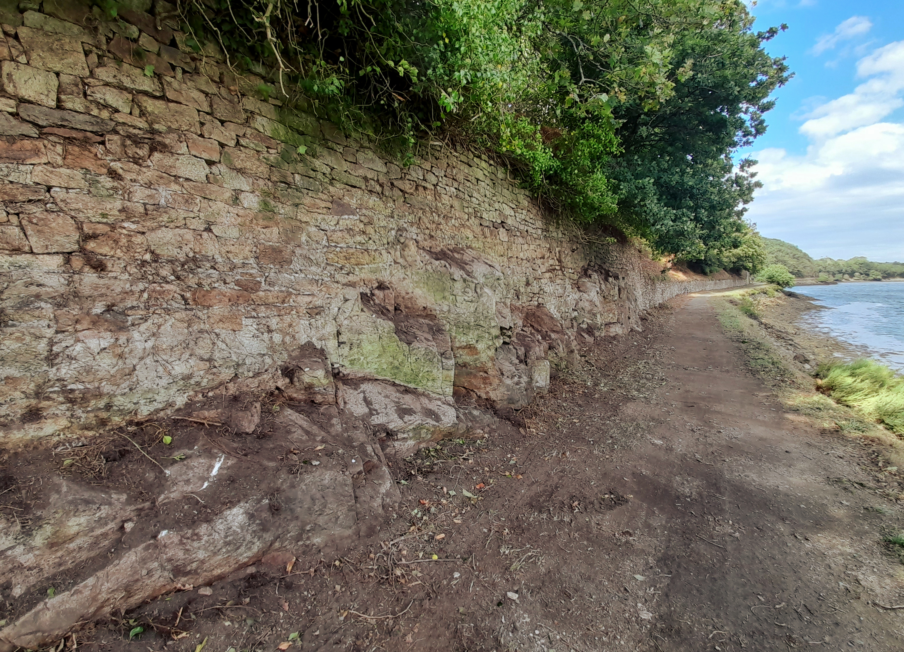 Mur de soutènement côté terre en aval du pont-physique. Vue générale de la partie sud et intégration dans le rocher existant.Immatriculation