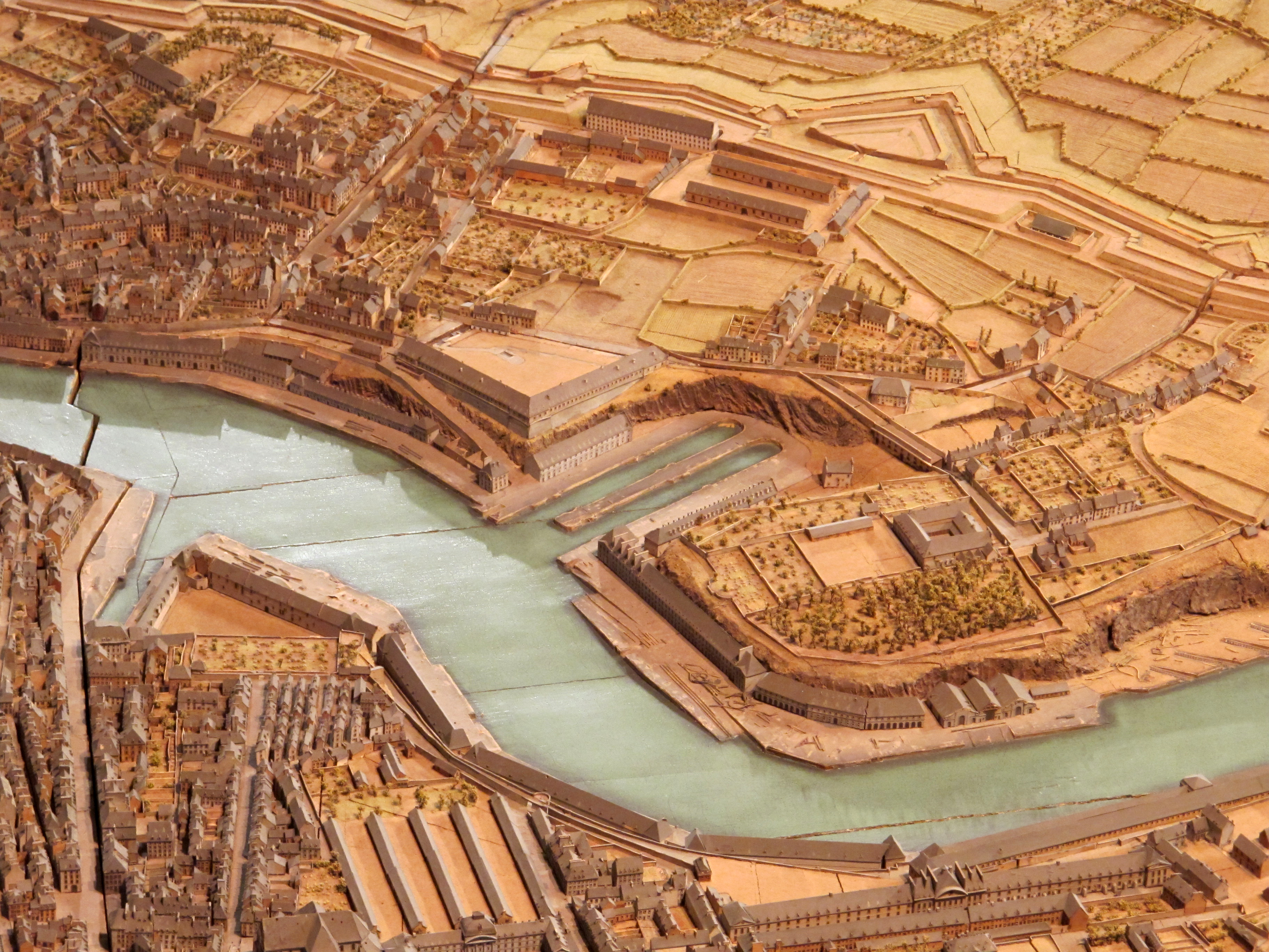 Vue générale du plan-relief de Brest depuis l'Est-nord-est (1807-1811) : la Penfeld et l'anse de Pontaniou. Dominant la Penfeld, l'ancien couvent des Capucins et ses jardins ; la nouvelle prison maritime de Pontaniou immédiatement derrière le Bâtiment aux LionsImmatriculation