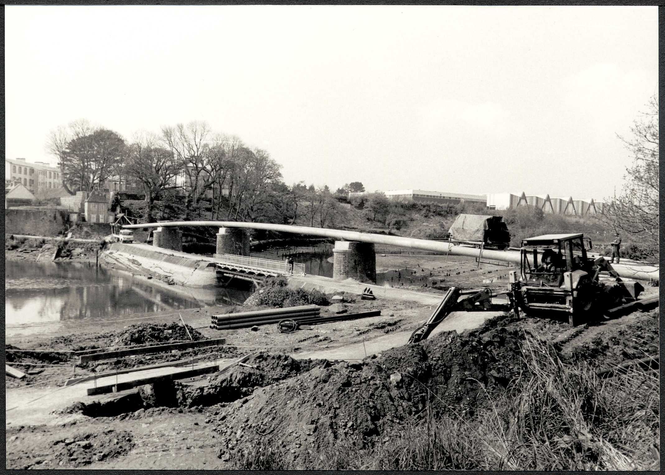 Vue de la passerelle et du corps de garde de la Villeneuve en 1989 (Archives municipales de Brest, 2Fi04398). Au premier plan, la PenfeldImmatriculation