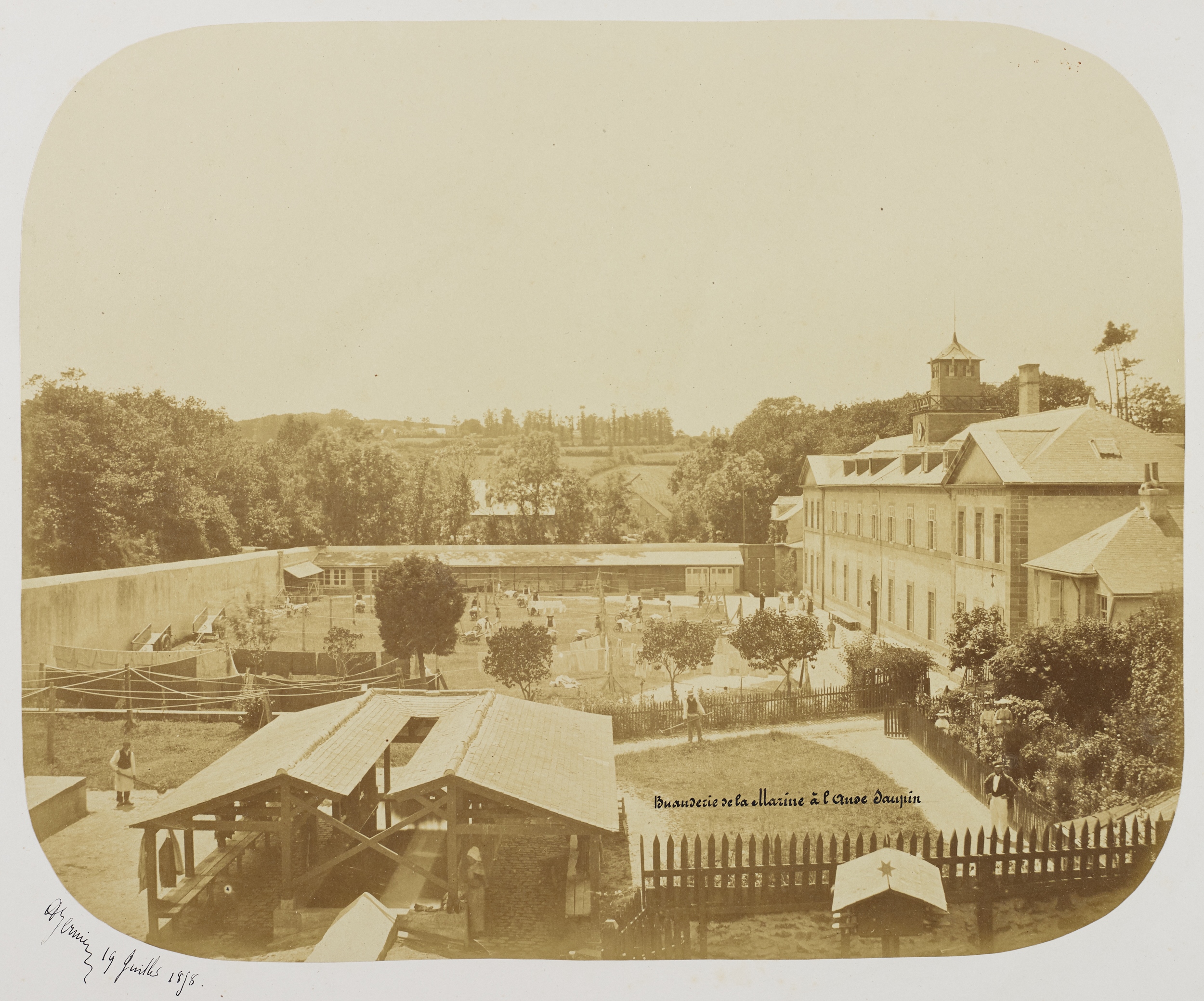 Vue générale depuis le nord-est par Alfred Bernier, 19 juillet 1858 (Musée de Bretagne : 2001.0034.18). Dans le jardin, séchage du linge sur fil (transporté en brouette). Au premier plan, l'un des lavoirsImmatriculation