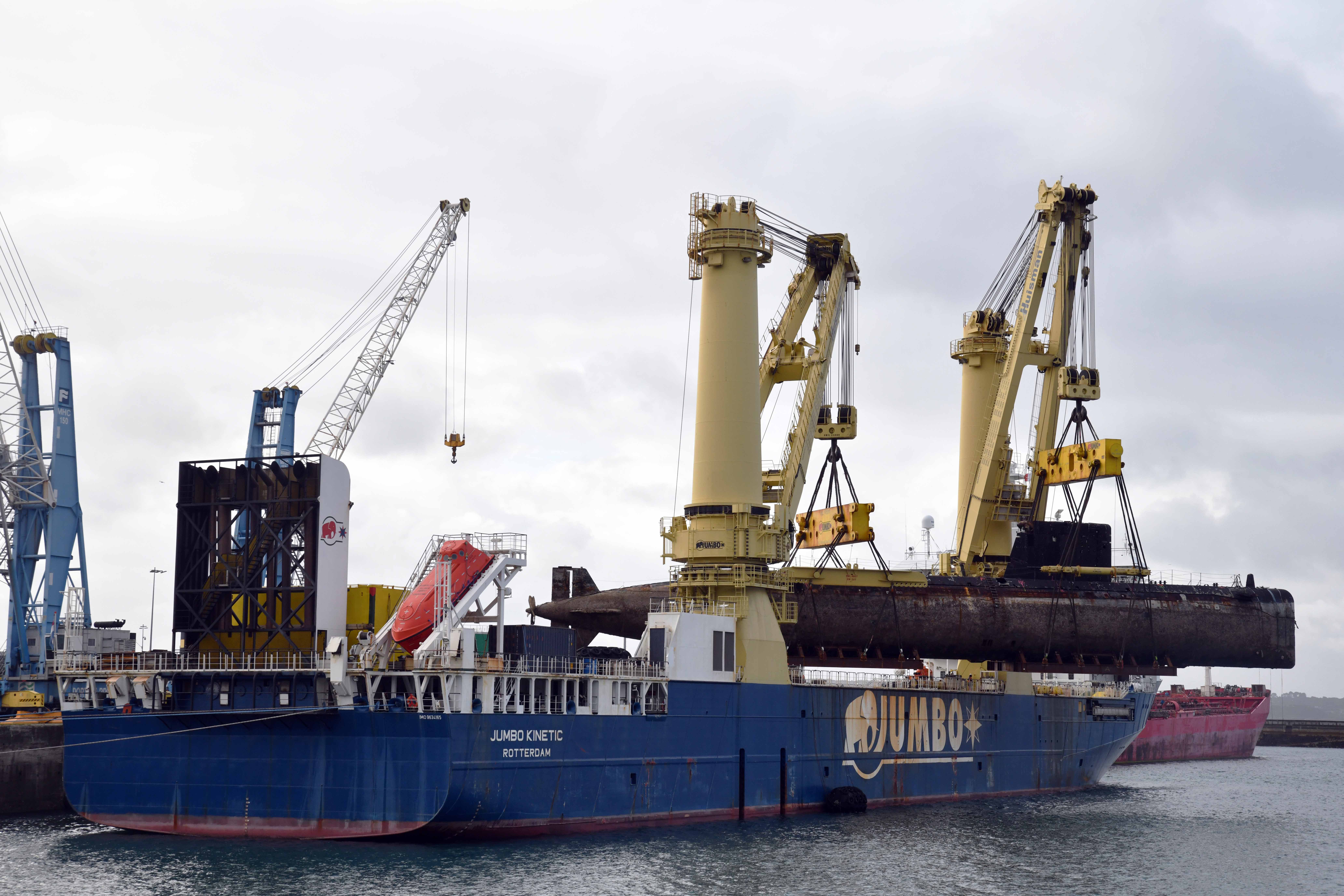 Déchargement de la coque de l’Agosta depuis le pont du Jumbo Kinetic au port de Brest, 6 août 2021Immatriculation