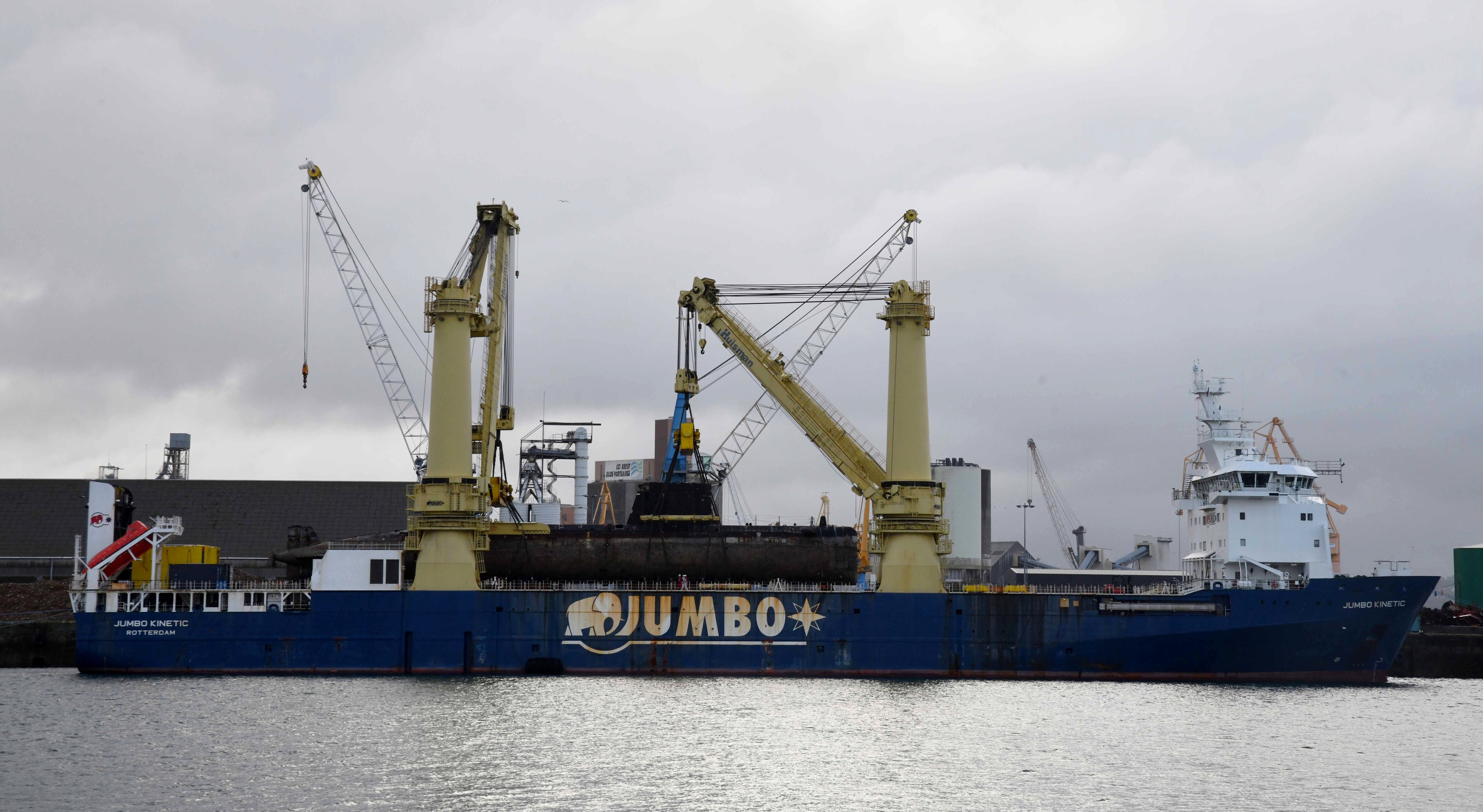 La coque de l’Agosta sur le pont du Jumbo Kinetic au port de Brest, 6 août 2021Immatriculation