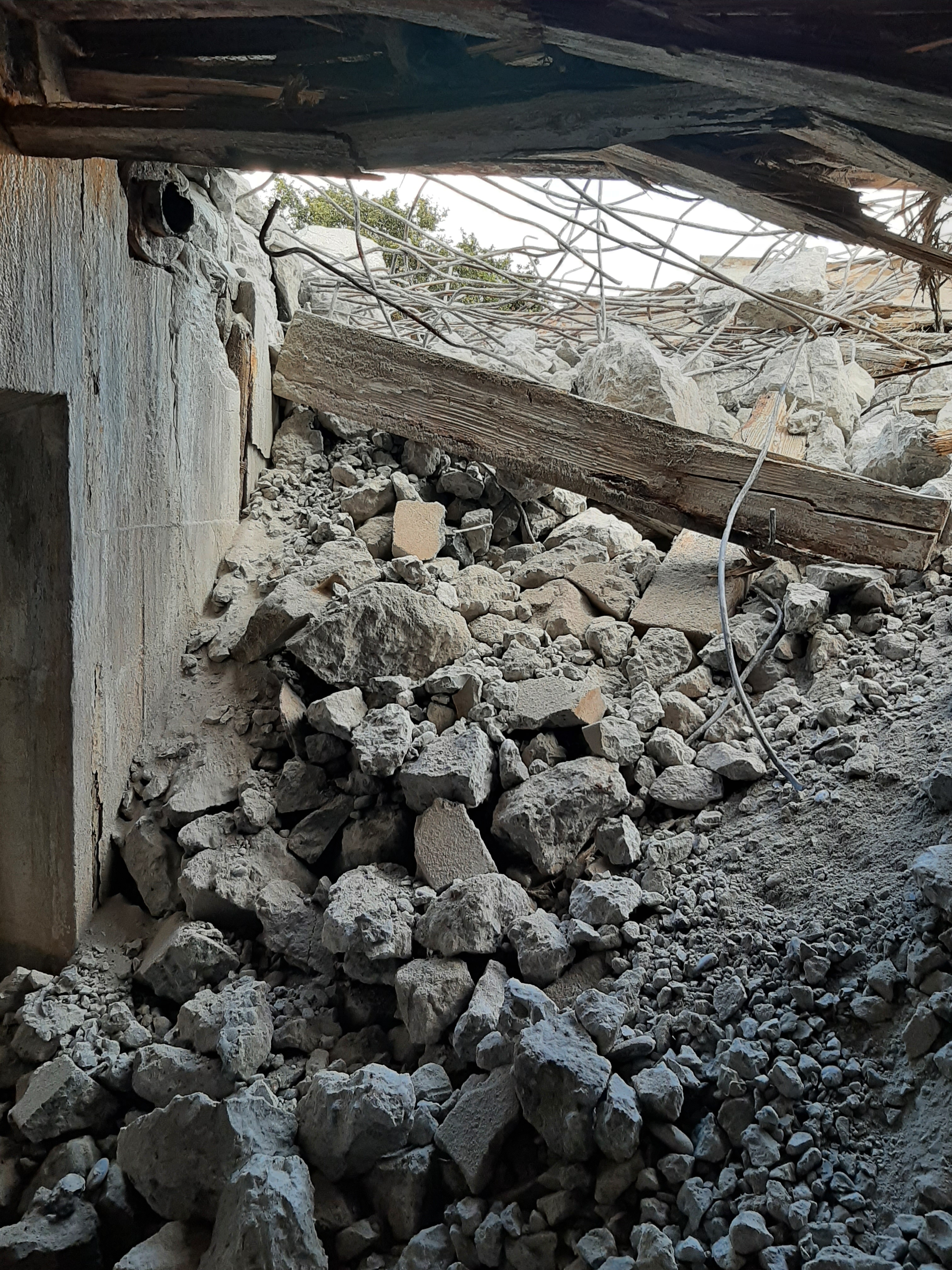 Vue de la déconstruction : pièce de vie - chambre de troupe (25 septembre 2022). Le plafond est constitué d'une alternance de poutres en acier en I et de poutres en bois avec au-dessus une couche de béton arméImmatriculation