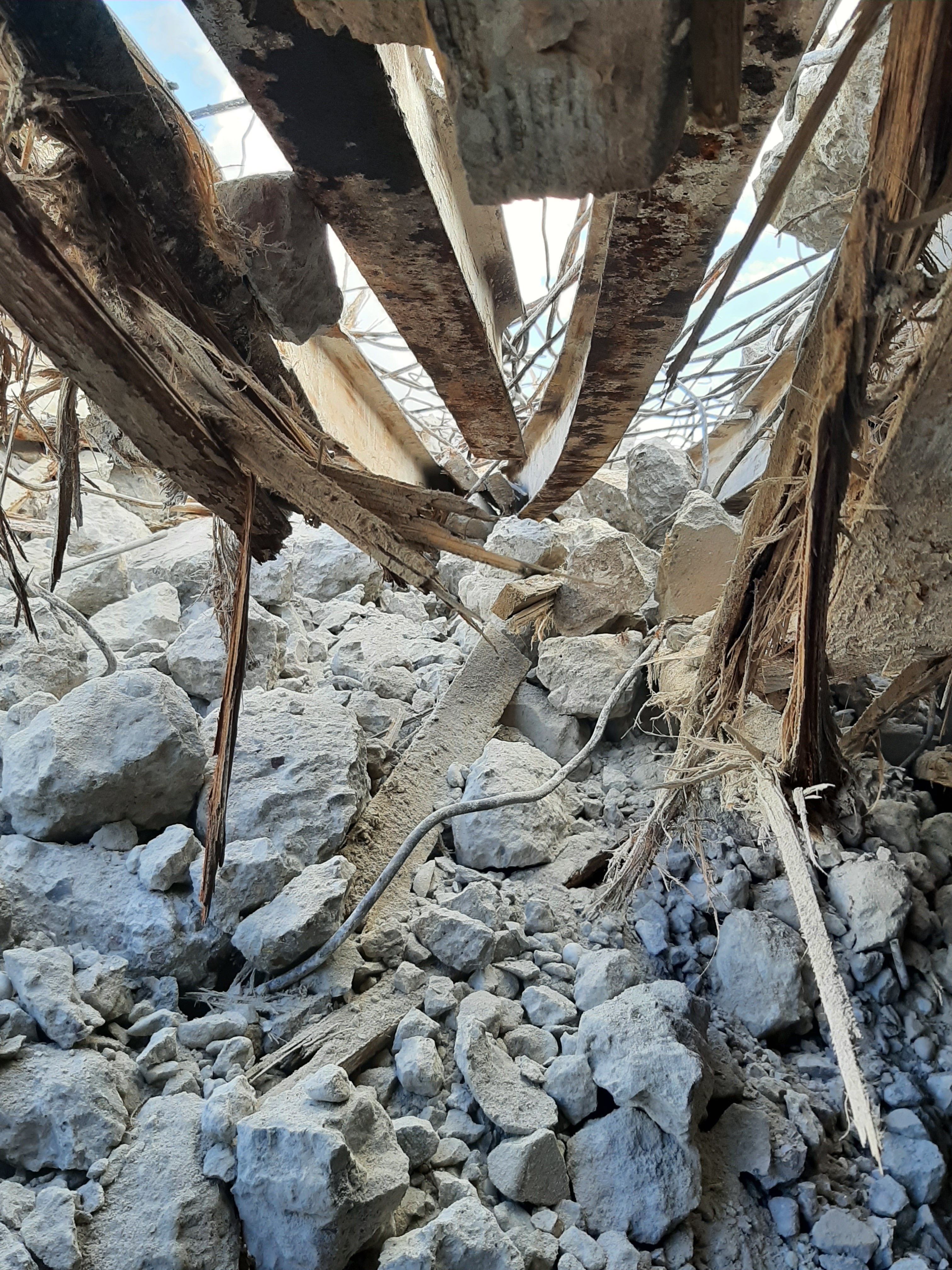 Vue de la déconstruction : pièce de vie - chambre de troupe (25 septembre 2022). Le plafond est constitué d'une alternance de poutres en acier en I et de poutres en bois avec au-dessus une couche de béton arméImmatriculation