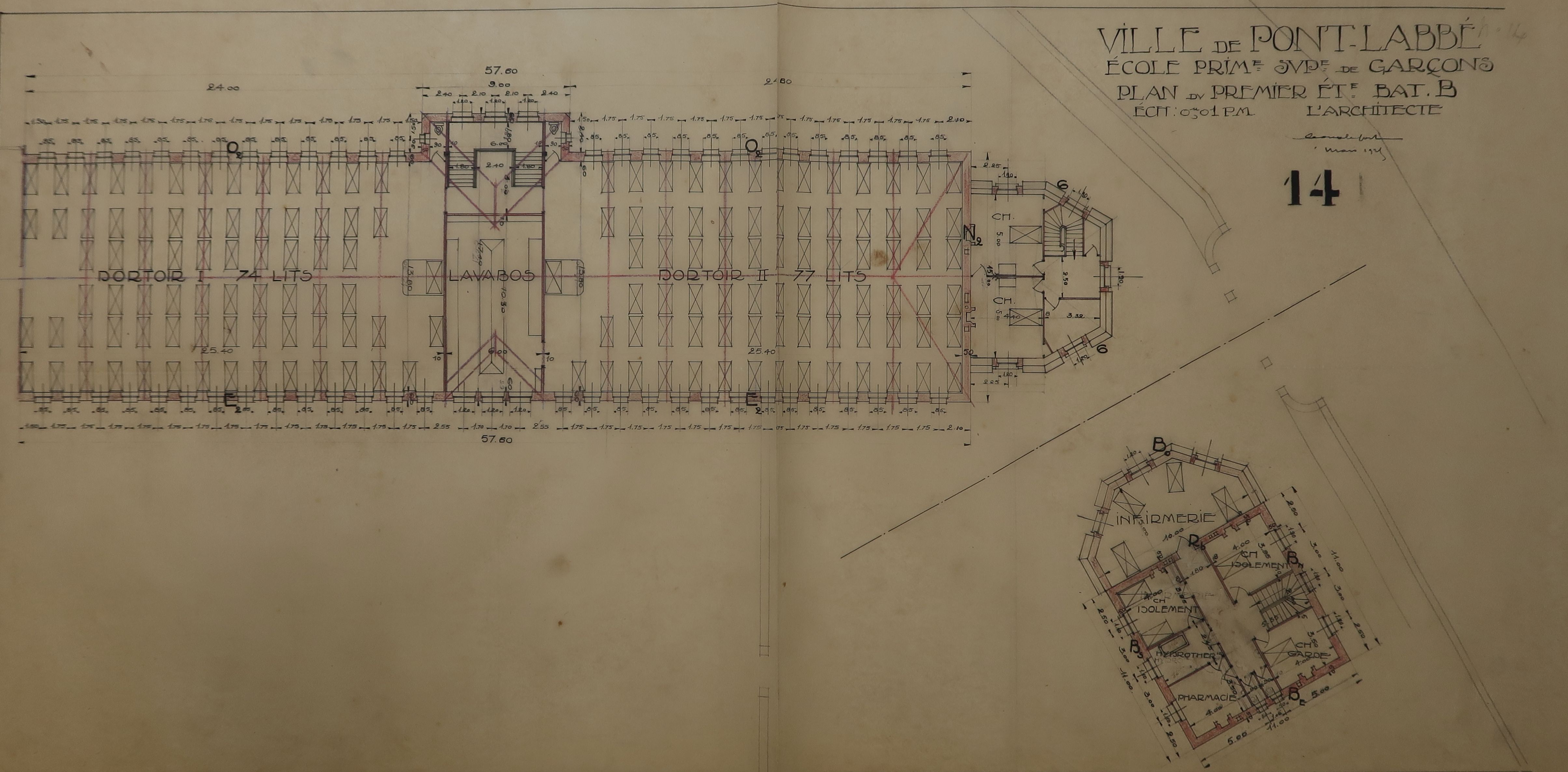 Plan du premier étage de l'aile nord et de l'infirmerie. Plan d'ensemble. G-R. Lefort, architecte, mars 1925. Deux dortoirs, lavabos, étage de l'infirmerie. Noter également l'escalier, un tiers hors-d'œuvre.Immatriculation