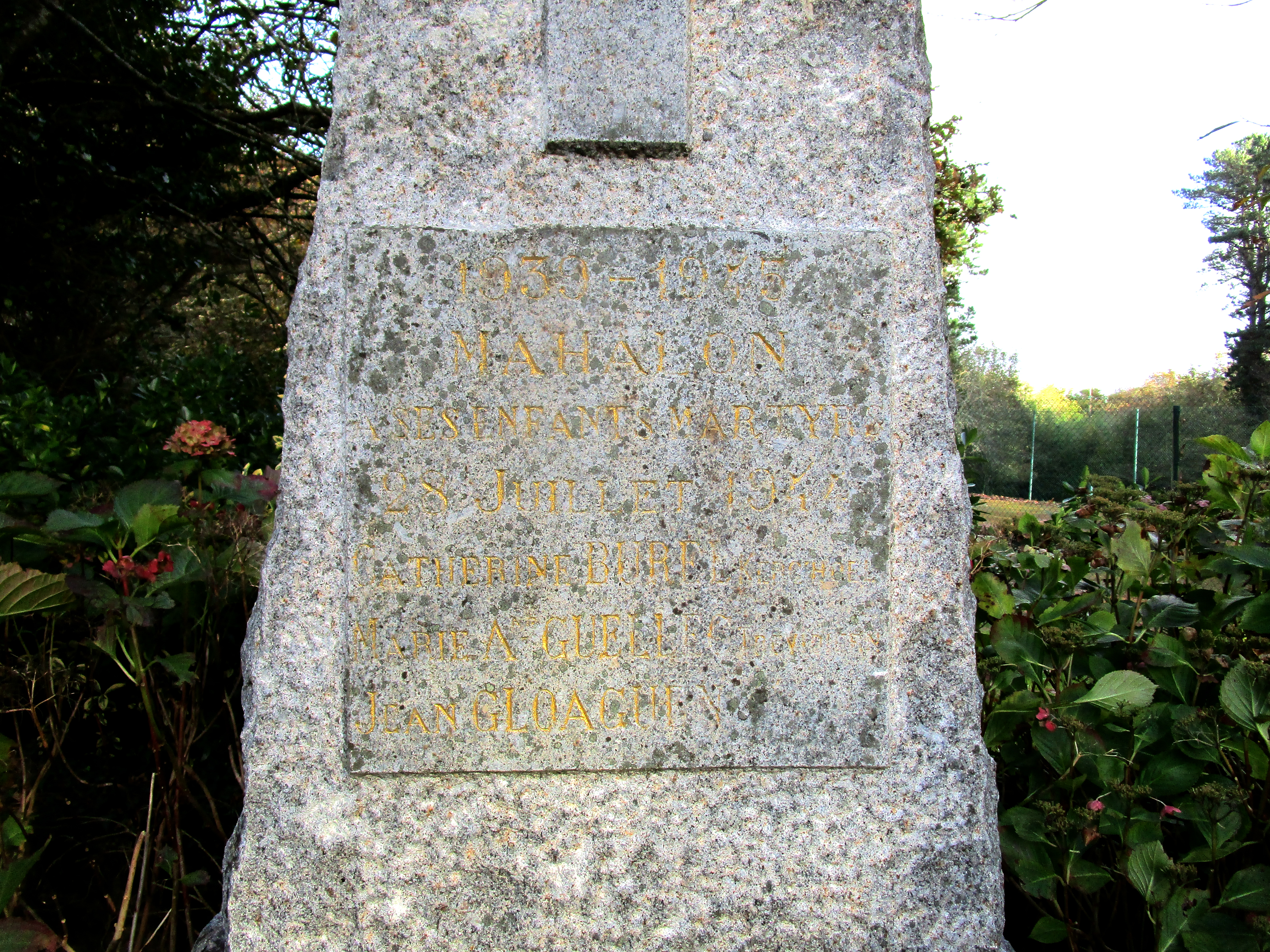 Détail de la plaque et inscription : 1939-1945 MAHALON A SES ENFANTS MARTYRS 28 JUILLET 1944 CATHERINE BUREL KERC’HOEL, MARIE-ANNE GUELLEC TREVIDIERN, JEAN GLOAGUEN.Immatriculation
