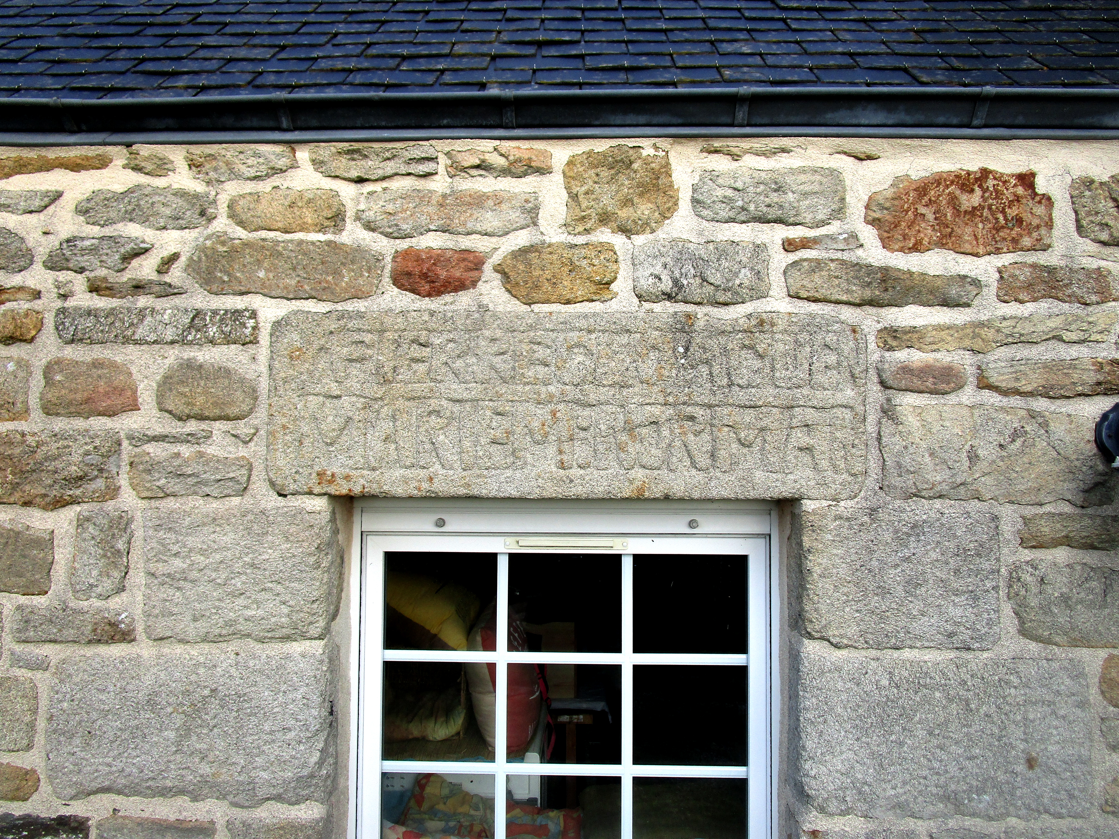 Kerhas Bras, ferme 1, détail du linteau de l'écurie et inscription : PIERRE:GLOAGUEN / MARIEP:NORMANT.Immatriculation