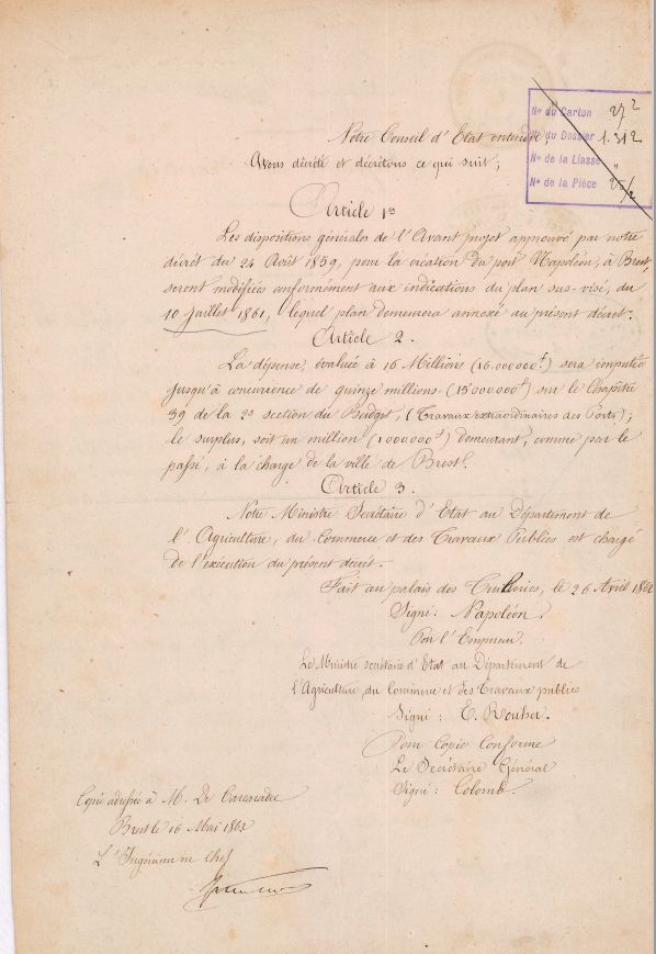 Décret du 26 avril 1862 approuvant modification du projet du port selon le plan jointImmatriculation