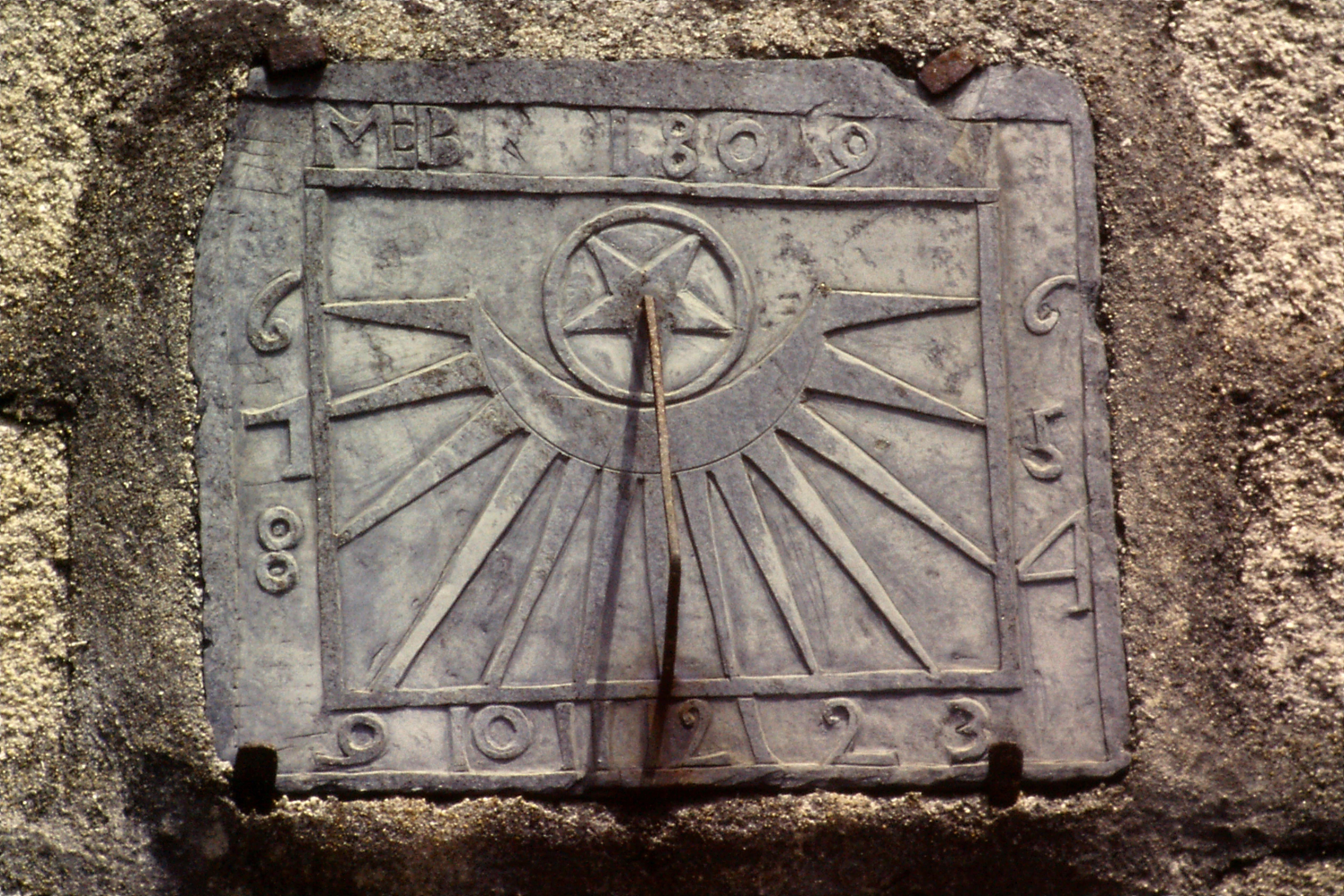 Mahalon, manoir. Cadran solaire daté 1809 sur la façade antérieure du logis. Inscription : M:B. (2001)Immatriculation