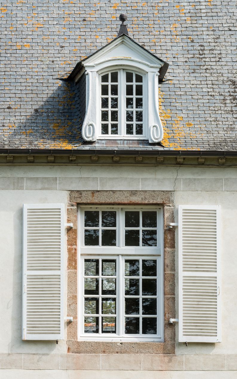 Vue de détail d'une travée avec baie et lucarne à volutes avec amortissement à bouleImmatriculation