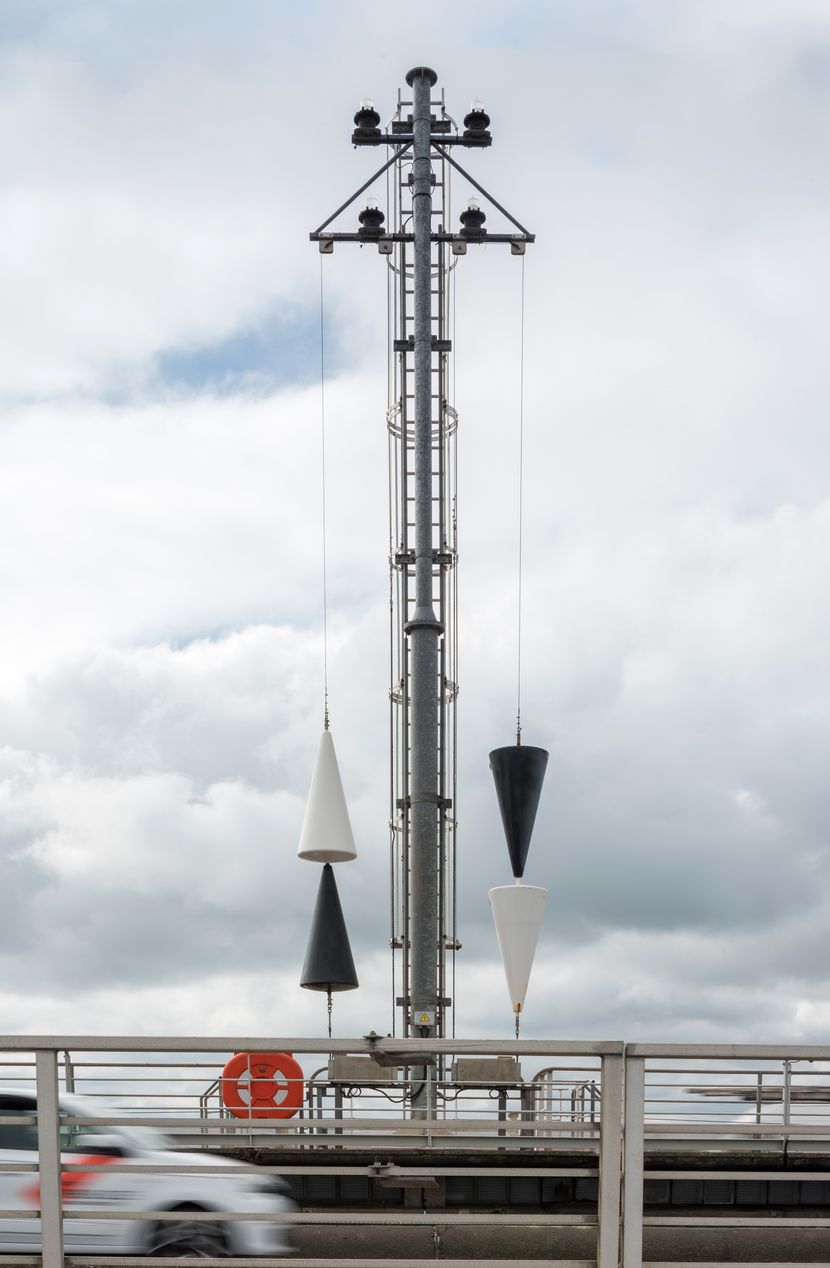 Détail d'un mât de signalisation à l'usage des navigants indiquant le sens de circulation des eaux dans le barrageImmatriculation