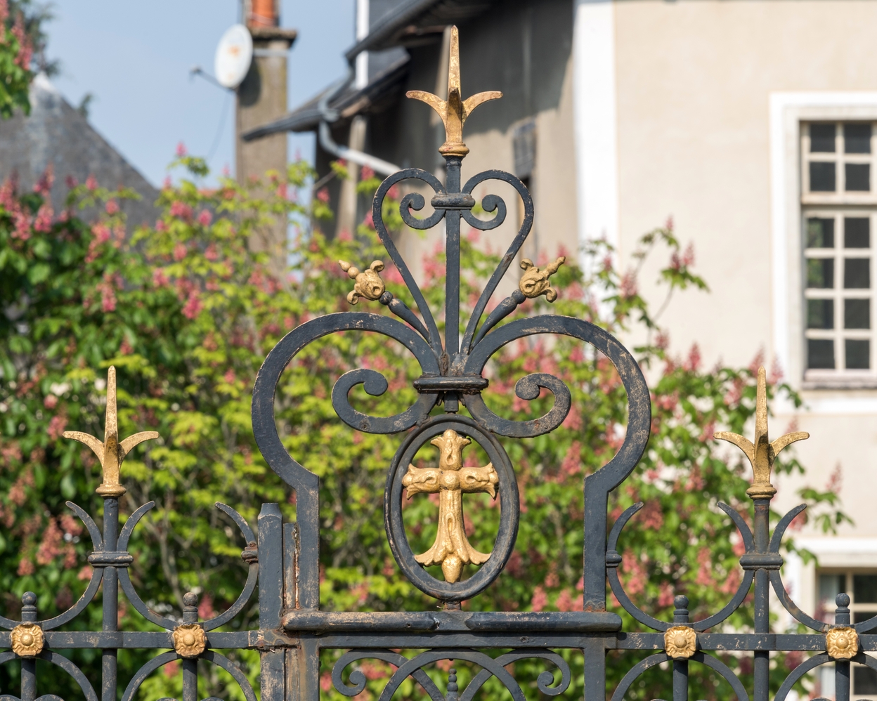 Grille de la place Saint-Melaine, détails de la grille peinte en noir, à l'exclusion des motifs décoratifs exécutés à la feuille d'or.Immatriculation