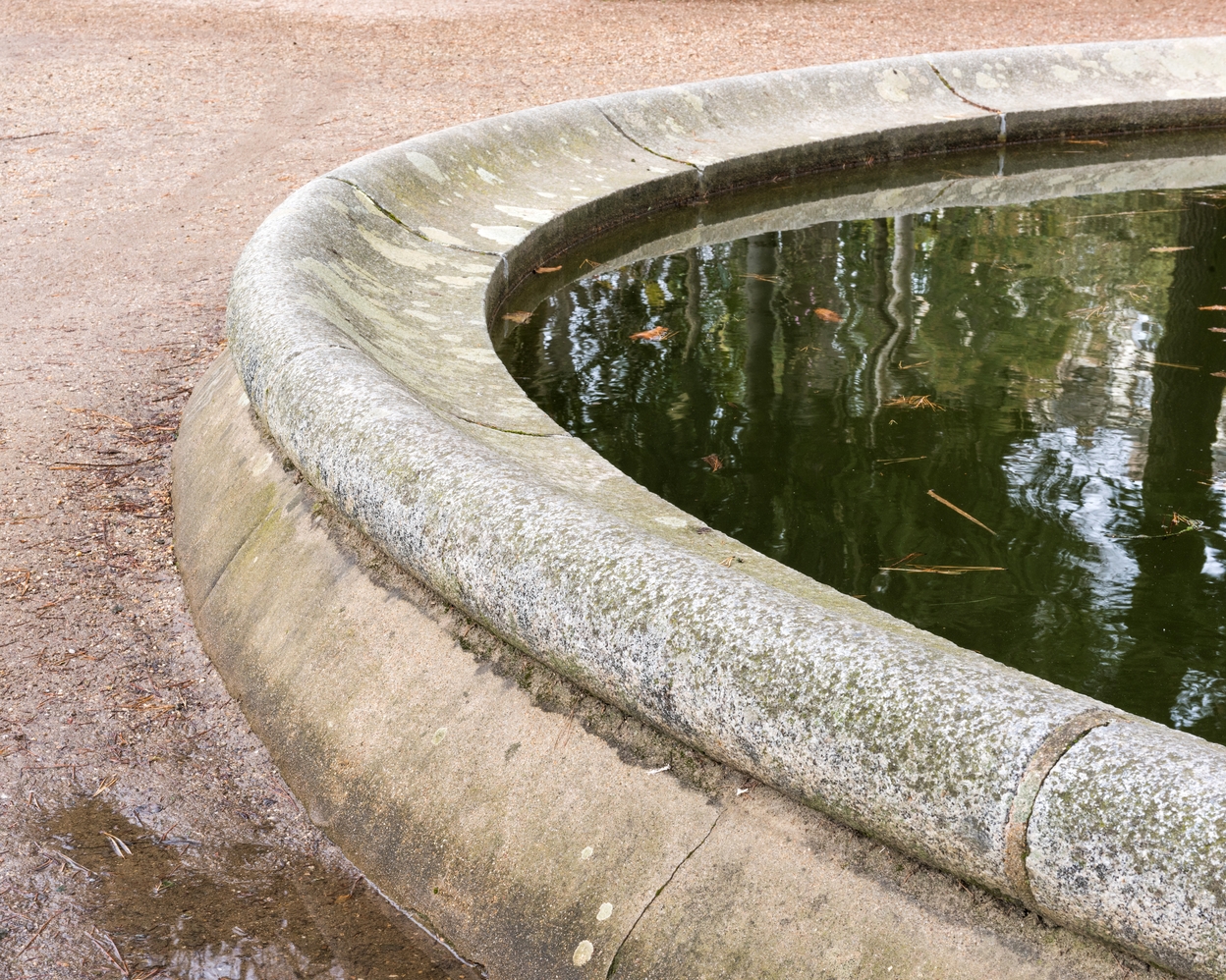 Bassin en granit situé au centre du jardin botanique, détails des bordsImmatriculation