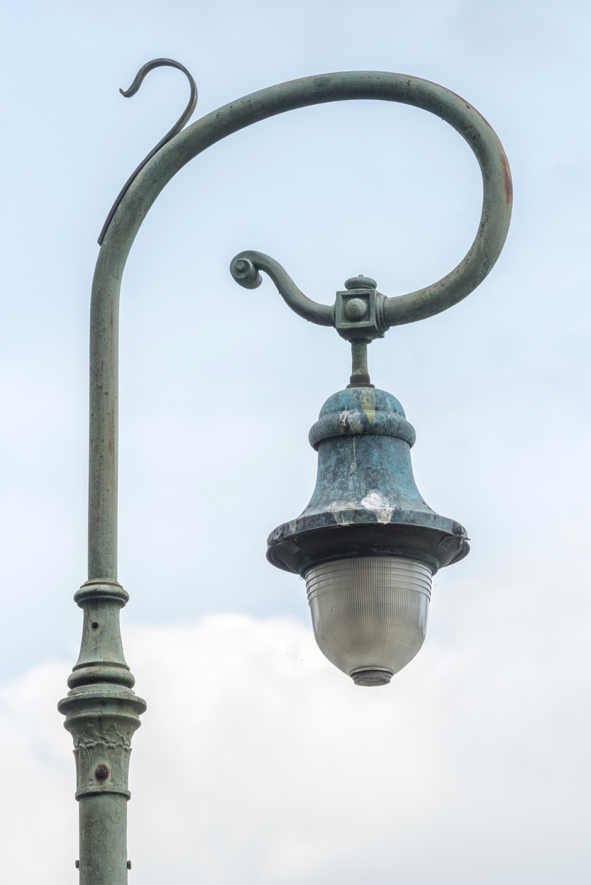 Détail d'un des 57 exemplaires de candélabres à crosse disséminés le long des allées du parc.Immatriculation