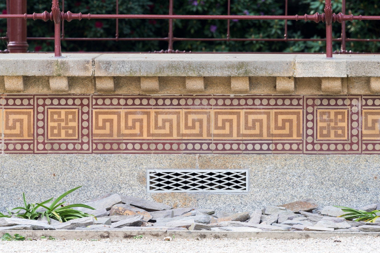 Frises en céramique sur les faces du soubassement de l'édificeImmatriculation