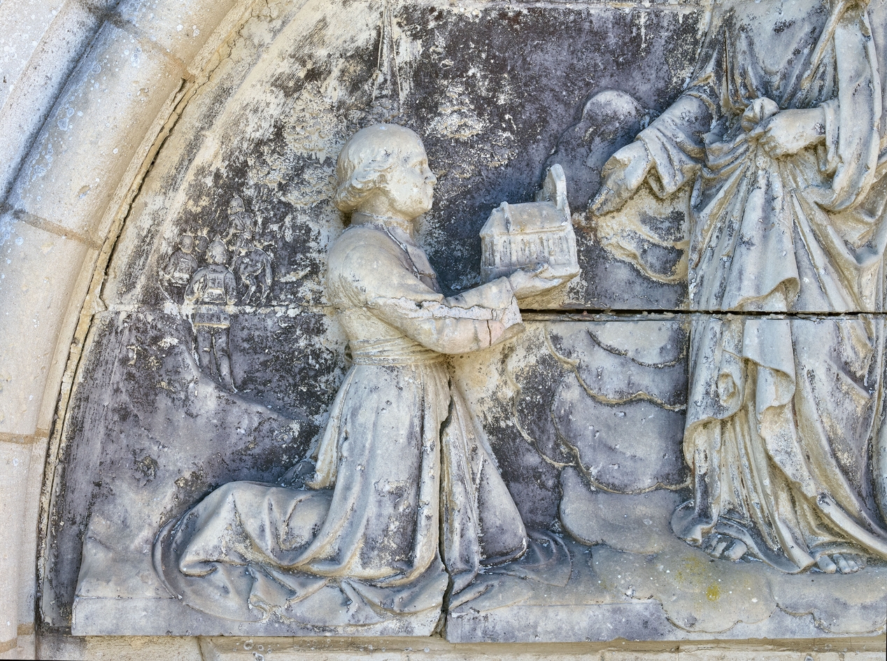 Détail partie gauche du tympan, l'abbé Nantel remet à saint Joseph la chapelle qui lui est dédié alors que les Prussiens s'éloignent (à gauche, en bas relief).Immatriculation