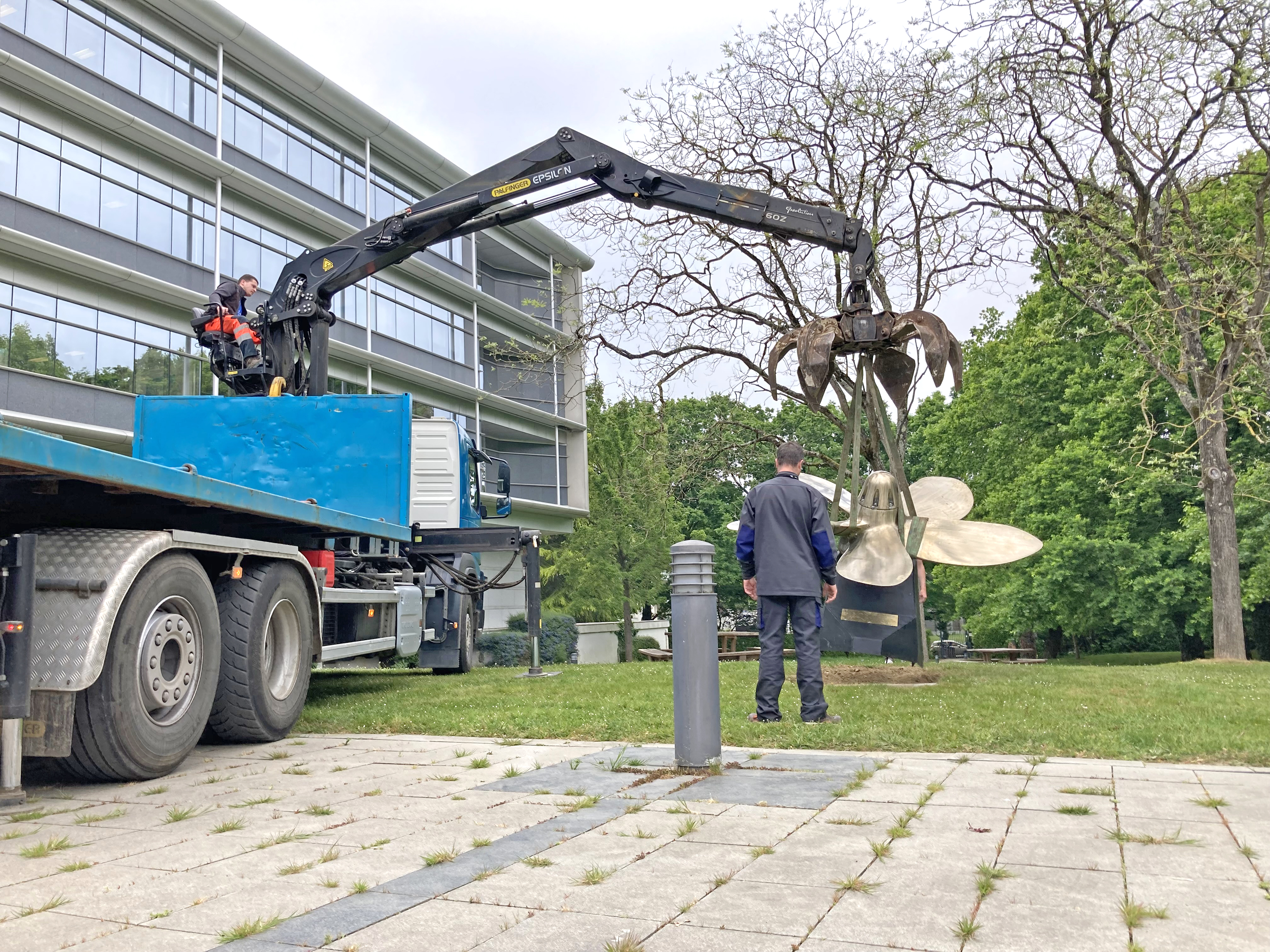 Vue de l'installation de l'hélice dans le Parc de l'Hôtel de Région par la société Navaleo, 6 mai 2022Immatriculation