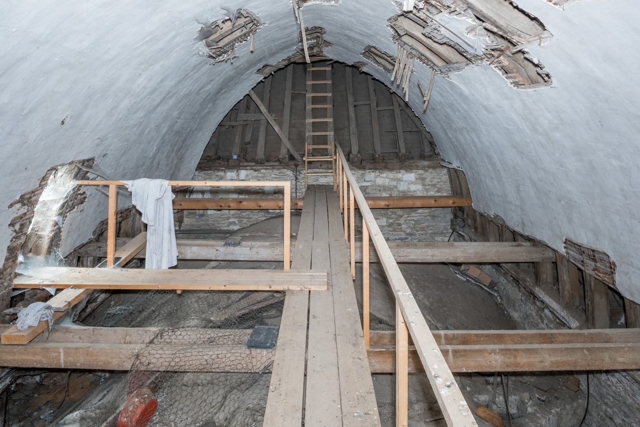 Vue de la charpente lambrissée au-dessus de la chapelle nord-est (chapelle de pèlerinage, ancienne chapelle sainte Catherine)Immatriculation