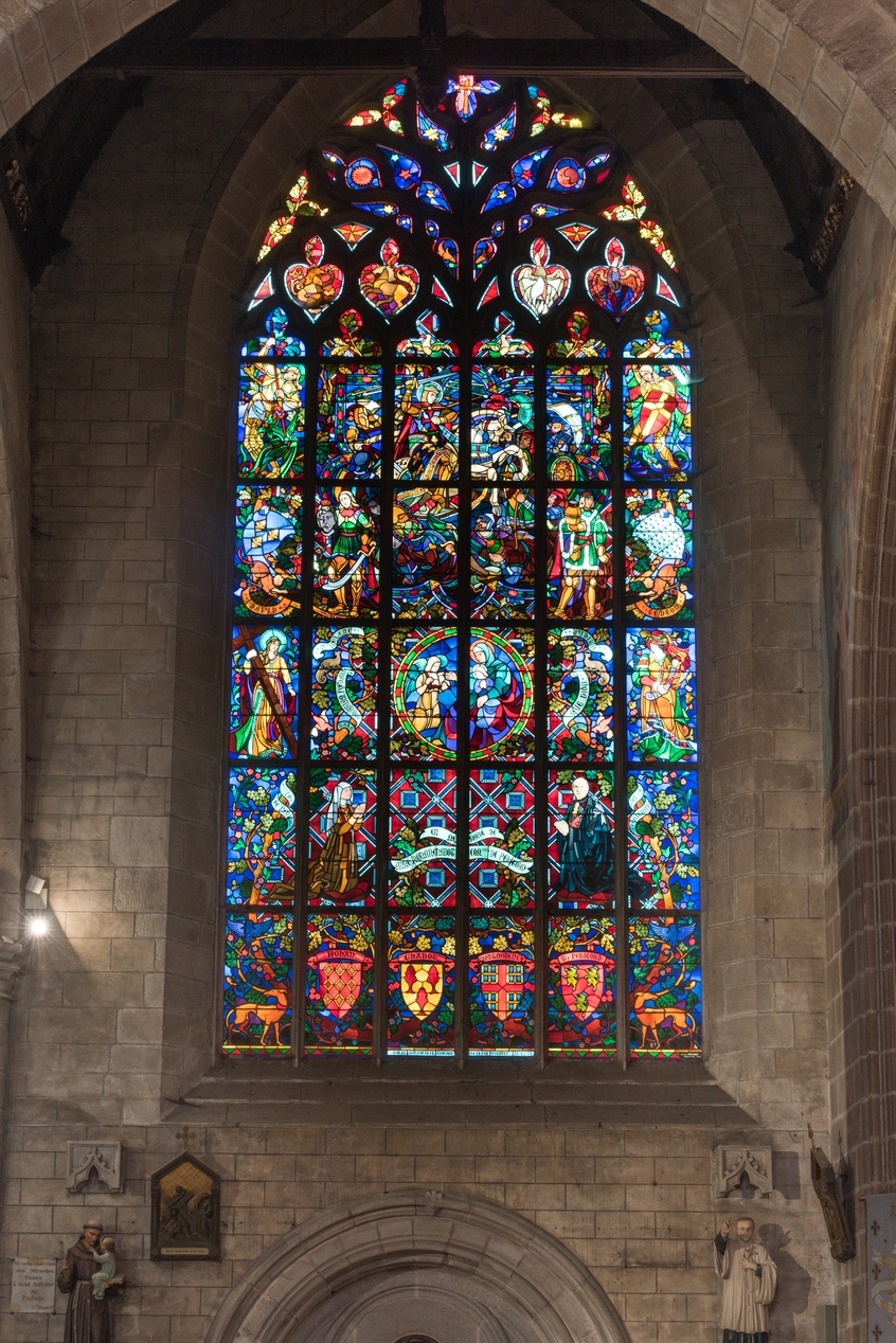 Verrière historiée de la baie 5 : La victoire de Gédéon sur les Madianites (?), basilique Notre-Dame-du-Roncier (Josselin),